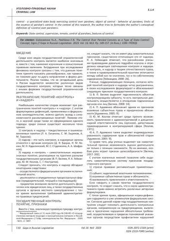 О. В. Филимонов понимает под посткриминальным контролем осуществление наблюдения за лицами, осужденными условно, с отсрочкой исполнения наказания, к ограничению по службе и к исправительным работам, подчеркивая, что данный вид контроля осуществляется не только со стороны государства, но и со стороны общественности [Филимонов, 1991: 34]. Позиция автора такова, что посткриминальный контроль – это автономная часть механизма уголовно-правового регулирования, обеспечивает экономию уголовной прогрессии. А. А. Дорожинский включает в понятие посткриминального контроля все категории лиц, состоящих на учете в УИИ, в том числе, контроль за УДО-осужденными [Дорожинский, 2021: 83]. К. В. Михайлов и вовсе отождествляет понятия посткриминального контроля и контроля за УДО-осужденными [Михайлов, 2010: 119]. На наш взгляд посткриминальный контроль не имеет ничего общего с контролем за УДО-осужденными и является больше криминологической характеристикой.