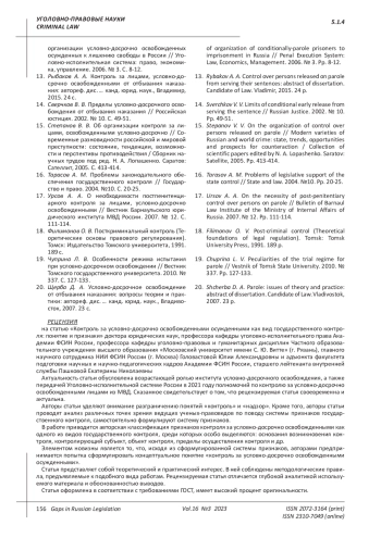13. Рыбаков А. А. Контроль за лицами, условно-досрочно освобожденными от отбывания наказания: автореф. дис. … канд. юрид. наук., Владимир, 2015. 24 с. EDN: MQZCGR