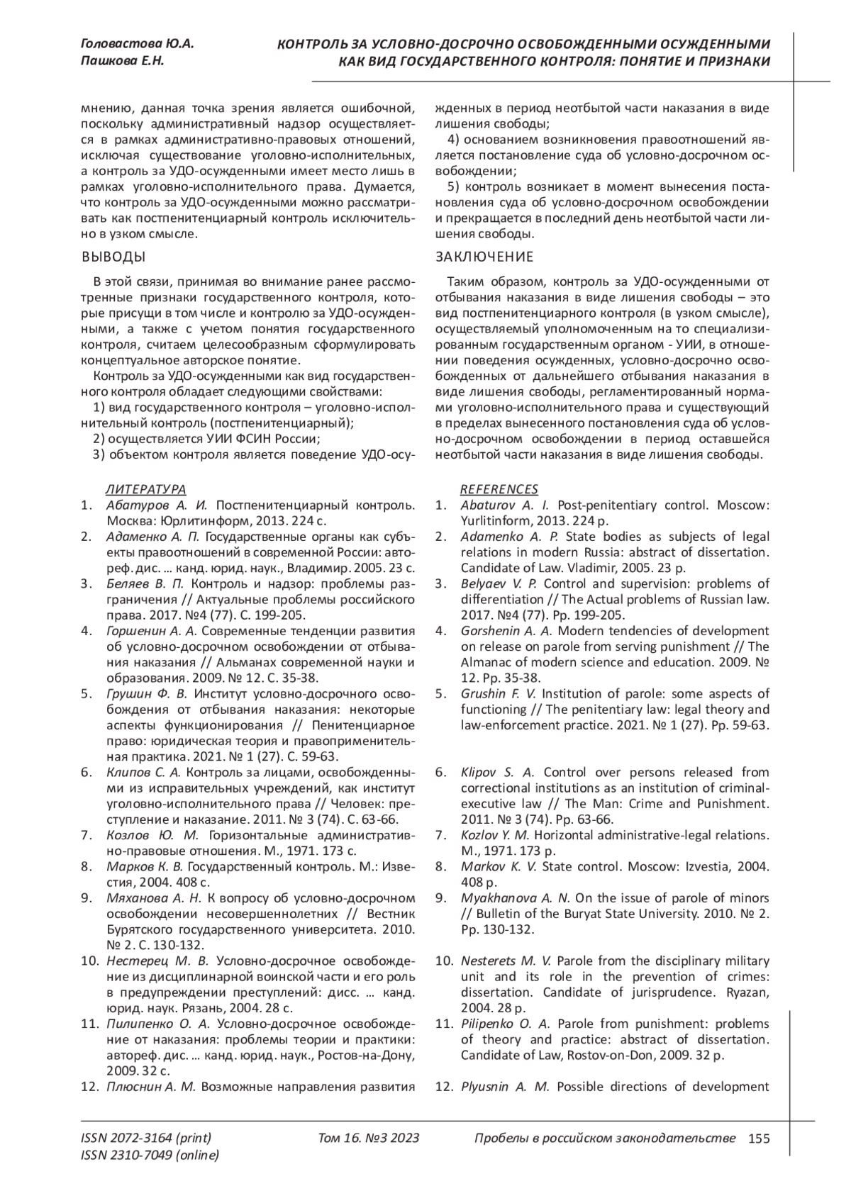6. Клипов С. А. Контроль за лицами, освобожденными из исправительных учреждений, как институт уголовно-исполнительного права // Человек: преступление и наказание. 2011. № 3 (74). С. 63-66. EDN: PWINTH