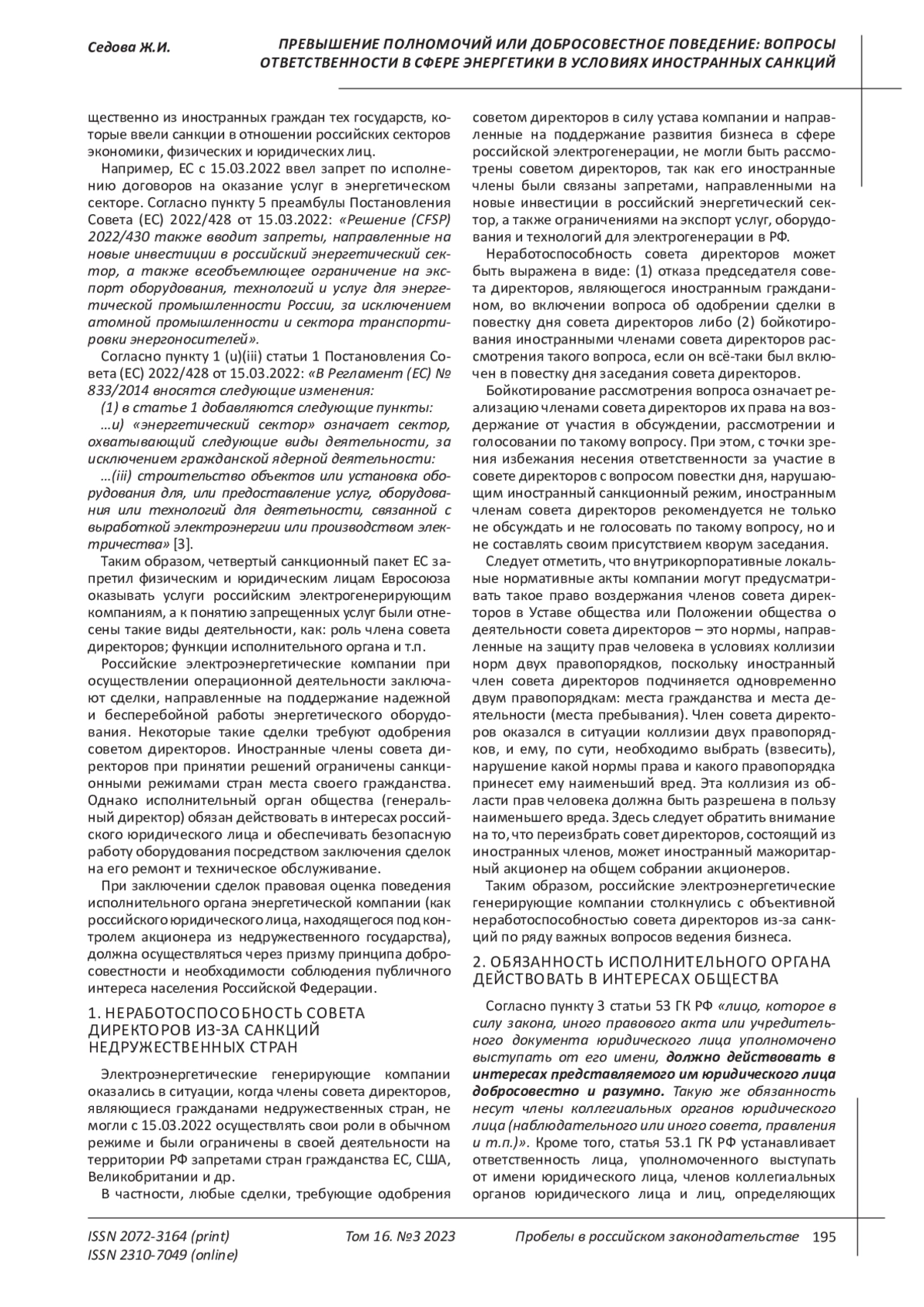 Задача: Причиной написания статьи являются трудности, с которыми столкнулись исполнительные органы российских энергетических компаний, находящихся в период действия иностранных санкционных режимов под контролем иностранных акционеров из недружественных стран. Неработоспособность состоящих из иностранных граждан советов директоров российских энергетических компаний из-за влияния иностранных односторонних мер ограничительного характера (санкций недружественных стран) привела к необходимости обеспечения хозяйственной деятельности таких компаний силами их исполнительного органа и менеджмента. Исполняя обязанность действовать в интересах общества разумно и добросовестно в ситуации бездействия совета директоров, исполнительный орган (генеральный директор) вынужден заключать сделки с формальным превышением полномочий. Цель статьи - выстроить линию защиты действий исполнительного органа как добросовестного поведения и предложить дополнения в действующее законодательство. Модель: Методологическая основа статьи - анализ поведения исполнительного органа юридического лица с точки зрения соблюдения требований принципов добросовестности, баланса публичных и частных интересов, а также на предмет защиты публичного интереса, выполнения установленной законом обязанности действовать в интересах общества, наличия крайней необходимости в действиях, а также установления полномочий, явствующих из обстановки. Областью исследования является добросовестность поведения исполнительного органа российского юридического лица, и способы ее доказывания с целью избежания ответственности исполнительного органа за заключение сделки с формальным превышением полномочий. Выводы: Превышение полномочий при заключении сделки без ее одобрения советом директоров отсутствует, если исполнительны орган докажет, что: (1) был найден баланс публичных и частных интересов; (2) не было иного способа для разрешения коллизии норм двух правопорядков или (3) публичный интерес [обеспечение надежного и бесперебойного энергоснабжения] обладает юридическим приоритетом для целей правовой защиты. Требуется уточнить норму пункта 2 статьи 53.1 ГК РФ, дополнить норму пункта 1 статьи 183 ГК РФ и наполнить новым правовым содержанием понятие «обстановка» в смысле пункта 1 статьи 182 ГК РФ. Рамки исследования/возможность последующего использования результатов научной работы: Результаты исследования являются частью нового комплексного подхода к изучению «недобросовестного поведения» как самостоятельного правового понятия, а также к обоснованию нового метода правового регулирования - отрицания недобросовестного поведения. Практическое значение: Автором предложена система доказывания добросовестности поведения исполнительного органа (генерального директора) на основе действующего законодательства. Для целей избежания ответственности за заключение сделки при отсутствии ее одобрения советом директоров генеральный директор российской компании должен смочь доказать следующее: деятельность общества связана с удовлетворением публичного интереса; прибыльность или выгодность сделки для общества; полномочия по подписанию сделки, явствовали из обстановки; наличие крайней необходимости в действиях исполнительного органа; факт уведомления совет