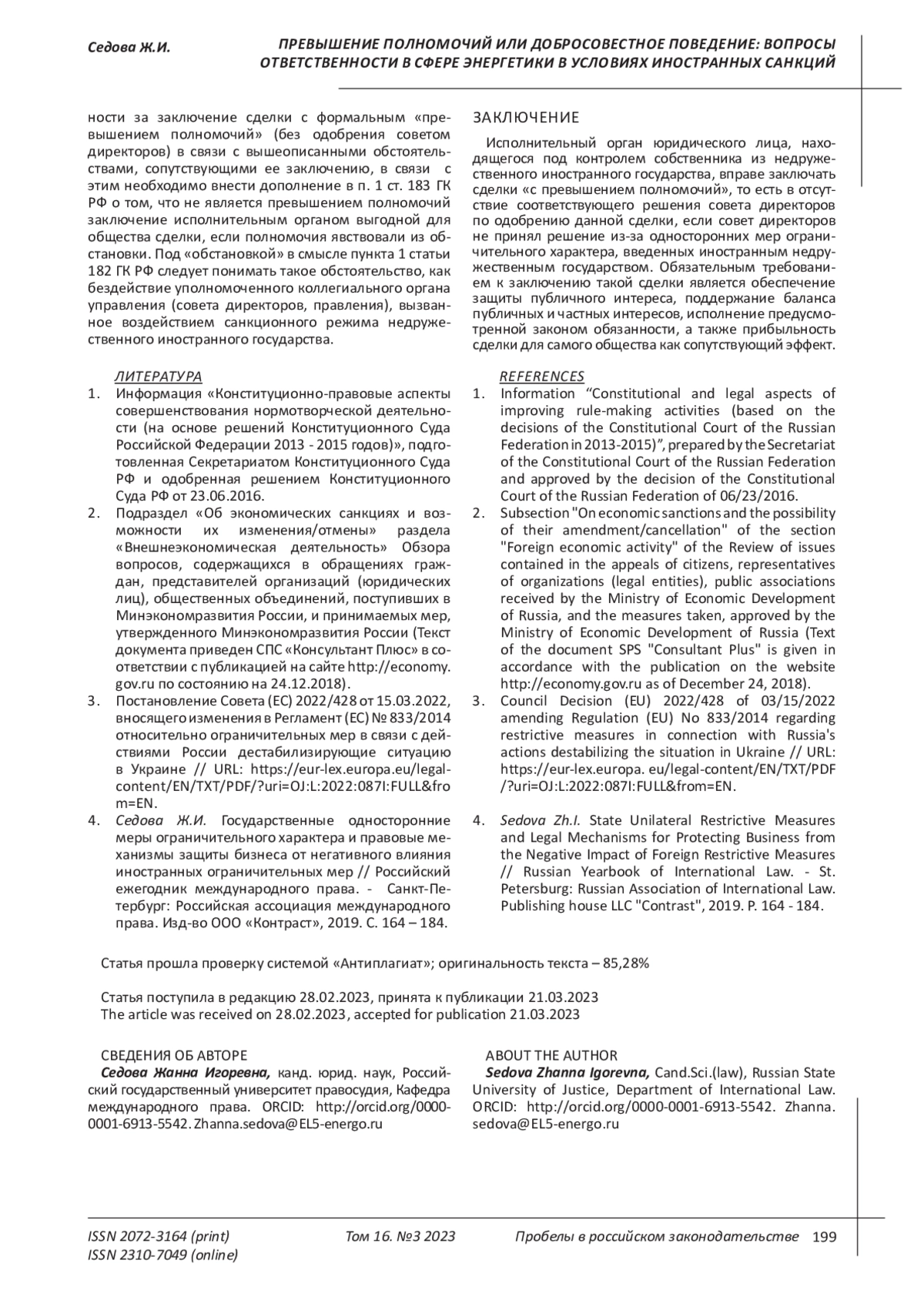 Sedova Zh.I. State Unilateral Restrictive Measures and Legal Mechanisms for Protecting Business from the Negative Impact of Foreign Restrictive Measures // Russian Yearbook of International Law. - St. Petersburg: Russian Association of International Law. Publishing house LLC “Contrast”, 2019. P. 164 - 184.