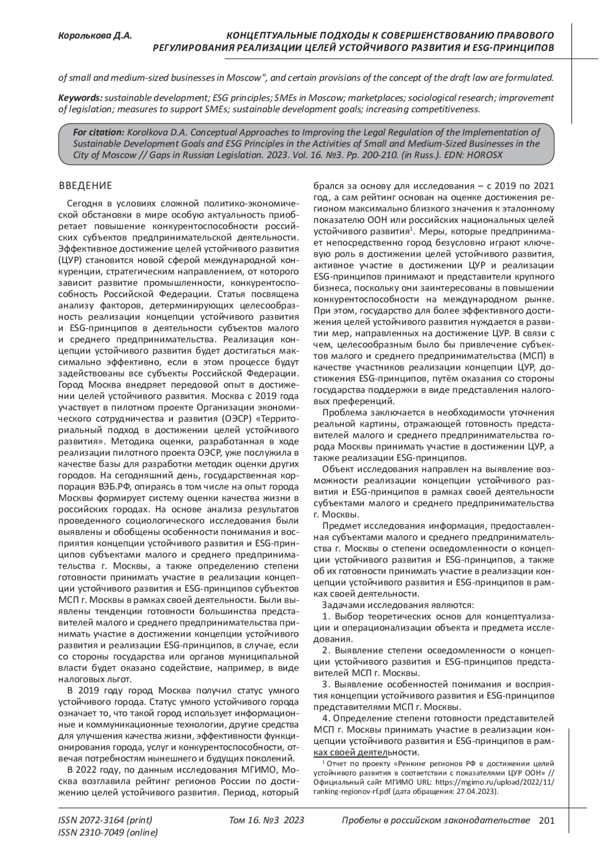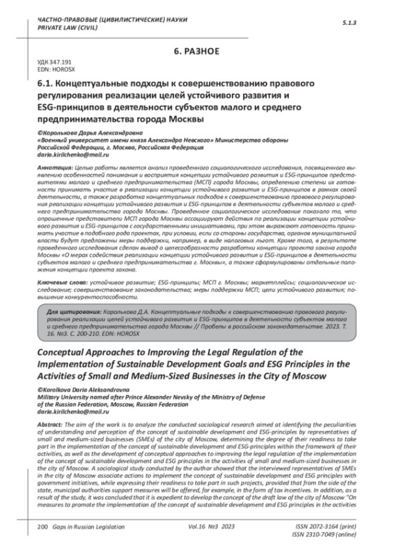 Целью работы является анализ проведенного социологического исследования, посвященного выявлению особенностей понимания и восприятия концепции устойчивого развития и ESG-принципов представителями малого и среднего предпринимательства (МСП) города Москвы, определению степени их готовности принимать участие в реализации концепции устойчивого развития и ESG-принципов в рамках своей деятельности, а также разработка концептуальных подходов к совершенствованию правового регулирования реализации концепции устойчивого развития и ESG-принципов в деятельности субъектов малого и среднего предпринимательства города Москвы. Проведенное социологическое исследование показало то, что опрошенные представители МСП города Москвы ассоциируют действия по реализации концепции устойчивого развития и ESG-принципов с государственными инициативами, при этом выражают готовность принимать участие в подобного рода проектах, при условии, если со стороны государства, органов муниципальной власти будут предложены меры поддержки, например, в виде налоговых льгот. Кроме того, в результате проведенного исследования сделан вывод о целесообразности разработки концепции проекта закона города Москвы «О мерах содействия реализации концепции устойчивого развития и ESG-принципов в деятельности субъектов малого и среднего предпринимательства г. Москвы», а также сформулированы отдельные положения концепции проекта закона.