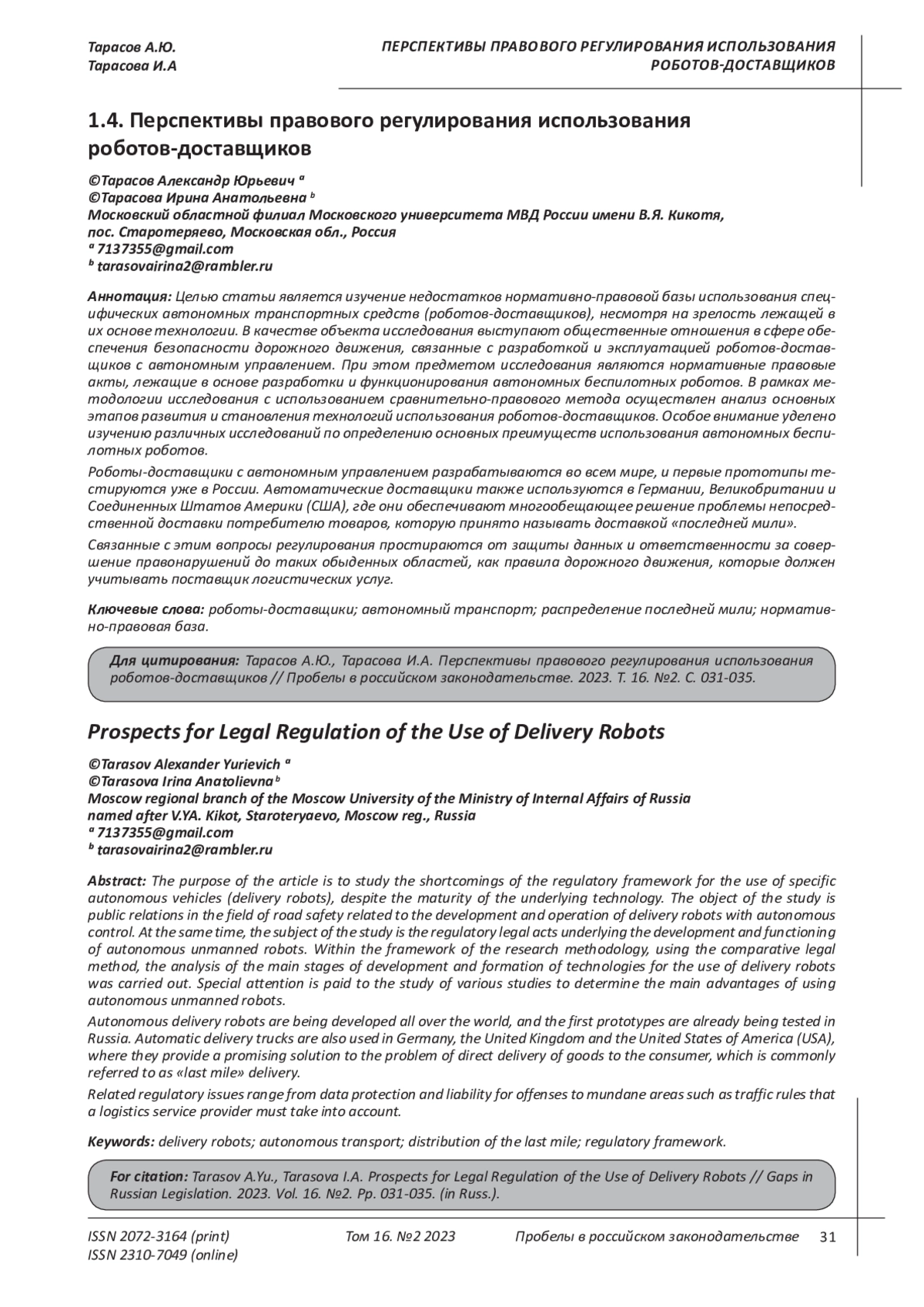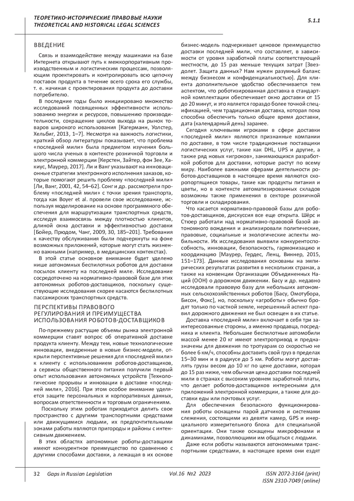 Целью статьи является изучение недостатков нормативно-правовой базы использования специфических автономных транспортных средств (роботов-доставщиков), несмотря на зрелость лежащей в их основе технологии. В качестве объекта исследования выступают общественные отношения в сфере обеспечения безопасности дорожного движения, связанные с разработкой и эксплуатацией роботов-доставщиков с автономным управлением. При этом предметом исследования являются нормативные правовые акты, лежащие в основе разработки и функционирования автономных беспилотных роботов. В рамках методологии исследования с использованием сравнительно-правового метода осуществлен анализ основных этапов развития и становления технологий использования роботов-доставщиков. Особое внимание уделено изучению различных исследований по определению основных преимуществ использования автономных беспилотных роботов. Роботы-доставщики с автономным управлением разрабатываются во всем мире, и первые прототипы тестируются уже в России. Автоматические доставщики также используются в Германии, Великобритании и Соединенных Штатов Америки (США), где они обеспечивают многообещающее решение проблемы непосредственной доставки потребителю товаров, которую принято называть доставкой «последней мили». Связанные с этим вопросы регулирования простираются от защиты данных и ответственности за совершение правонарушений до таких обыденных областей, как правила дорожного движения, которые должен учитывать поставщик логистических услуг.