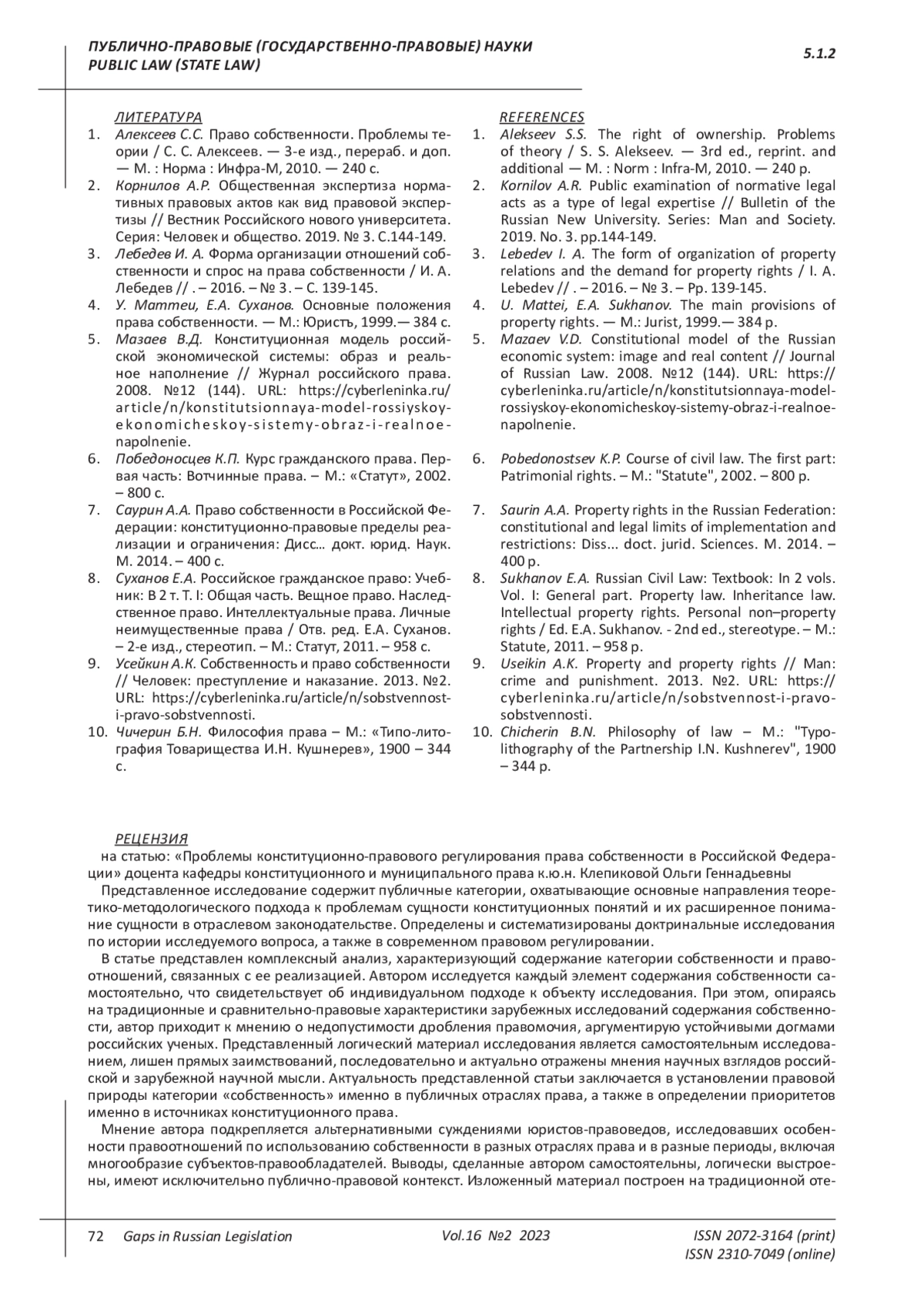 Saurin A.A. Property rights in the Russian Federation: constitutional and legal limits of implementation and restrictions: Diss… doct. jurid. Sciences. M. 2014. - 400 p. EDN: SPKVVD