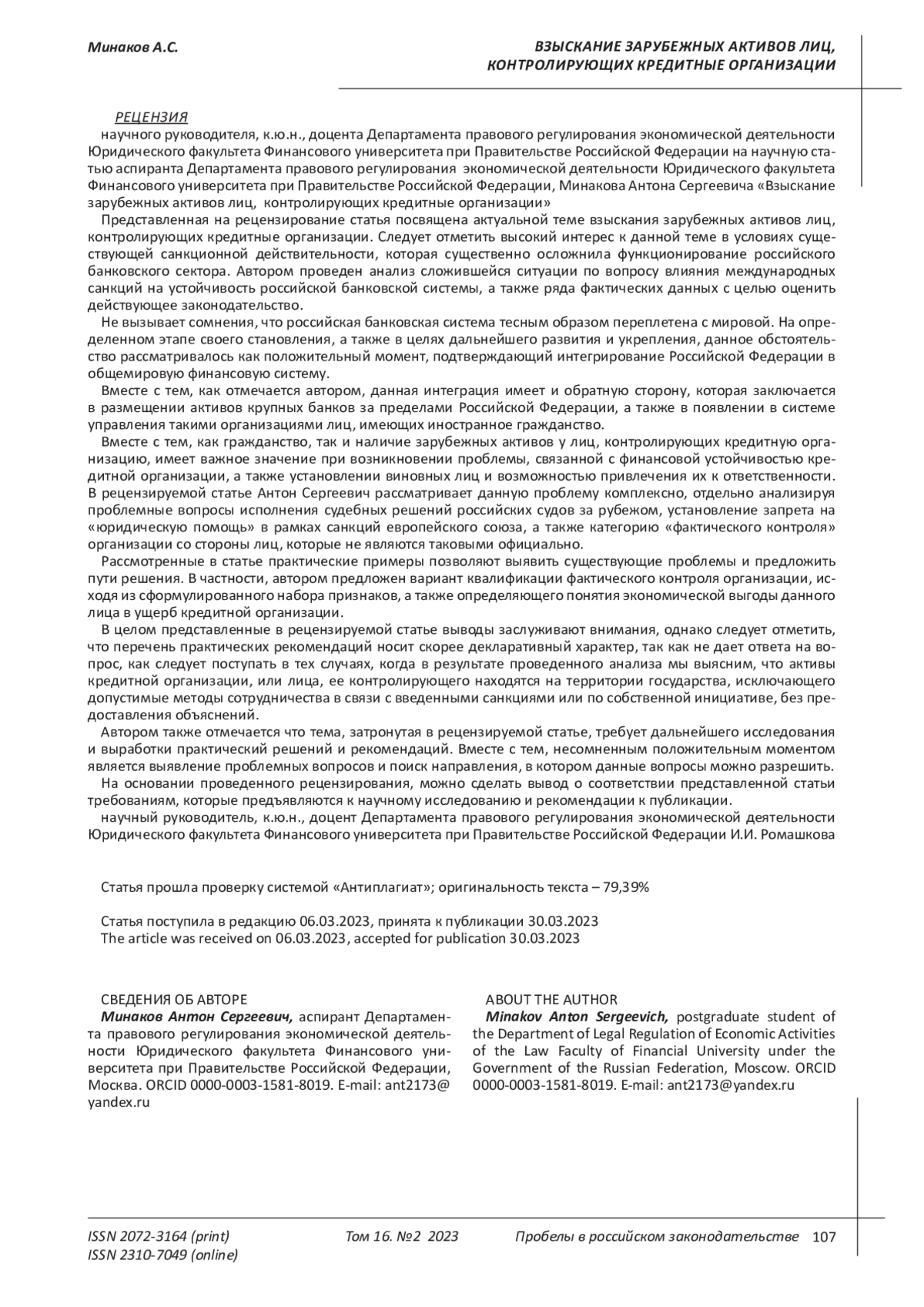 12. Улезко А. Новые подходы к субсидиарной ответственности лиц, осуществляющих фактический контроль // “Юридическая работа в кредитной организации”. 2018. № 1.