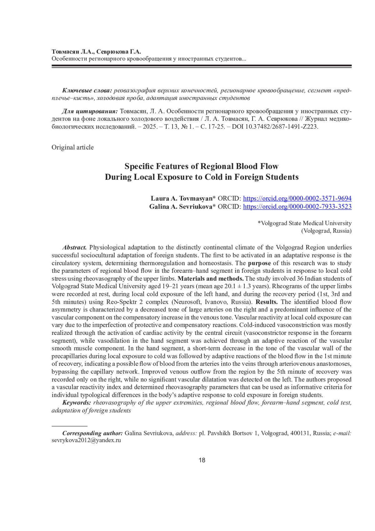 Результаты. Выявленная асимметрия кровообращения характеризуется снижением тонуса крупных артерий справа и преобладающим влиянием сосудистого компонента на компенсаторное повышение венозного тонуса. Сосудистая реактивность на фоне локального холодового воздействия может варьировать за счет несовершенности защитно-компенсаторных реакций. Холодовой сосудосуживающий эффект в большей степени реализовывался через активацию центральным контуром сердечной деятельности (констрикторная сосудистая реакция в сегменте «предплечье»), тогда как вазодилатация сосудов в сегменте «кисть» достигалась через срочную адаптивную реакцию сосудистого гладкомышечного компонента. В сегменте «кисть» кратковременное снижение тонуса сосудистой стенки прекапилляров в ответ на холодовое воздействие сменялось приспособительными реакциями кровотока в 1-ю минуту восстановления, что свидетельствует о возможном поступлении крови из артерий в вены через артериоло-венулярные анастомозы, минуя капиллярную сеть. Облегчение венозного оттока из региона к 5-й минуте восстановления отмечалось только справа, тогда как слева не обнаружено значимой дилатации сосудов, соотнесенной с резервом сосудистого сопротивления холодовому воздействию. Авторами предложен индекс реактивности сосудов и определены показатели реовазографии, которые можно использовать как информативные критерии индивидуально-типологических различий адаптивной реакции организма иностранных студентов на холодовое воздействие.