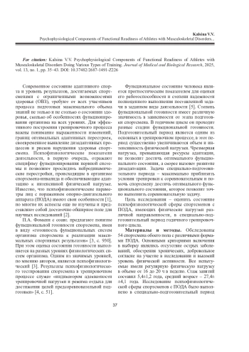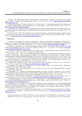 1. Kozina Z., Lytovchenko M., Safronov D., Boichuk Y., Chaika O., Shepelenko T., Polianskyi A., Protsevskiy V., Peretyaha L., Konnova M. Influence of Musculoskeletal System Dysfunction Degree on Psychophysiological Indicators of Paralympic Athletes // Sports (Basel). 2019. Vo l. 7, No 3. Art. No 55. DOI: 10.3390/sports7030055 EDN: QOZHFG