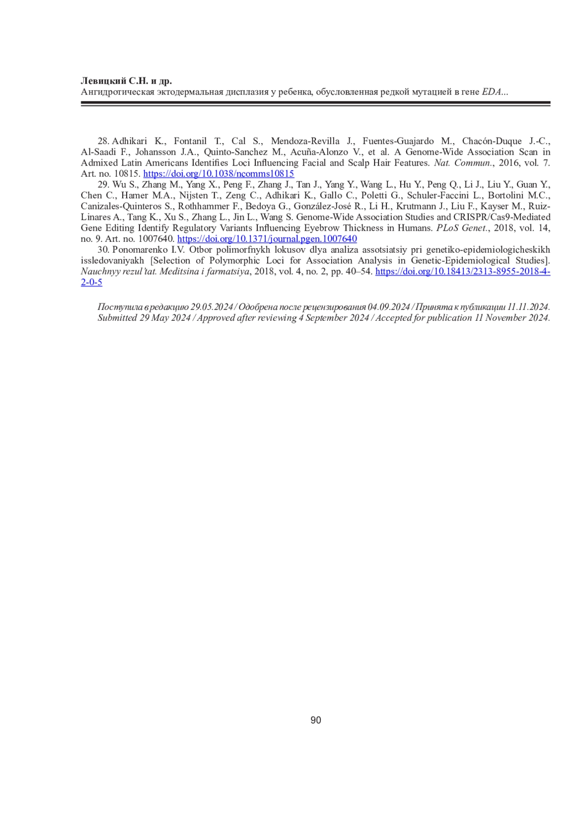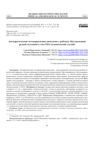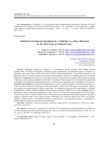 ЛЕВИЦКИЙ С. Н., ГАГАРИНА Т. Ю., ДАВЫДОВА Н. Г. АНГИДРОТИЧЕСКАЯ ЭКТОДЕРМАЛЬНАЯ ДИСПЛАЗИЯ У РЕБЕНКА, ОБУСЛОВЛЕННАЯ РЕДКОЙ МУТАЦИЕЙ В ГЕНЕ EDA (КЛИНИЧЕСКИЙ СЛУЧАЙ) // ЖУРНАЛ МЕДИКО-БИОЛОГИЧЕСКИХ ИССЛЕДОВАНИЙ. 2025. Т. 13 № 1