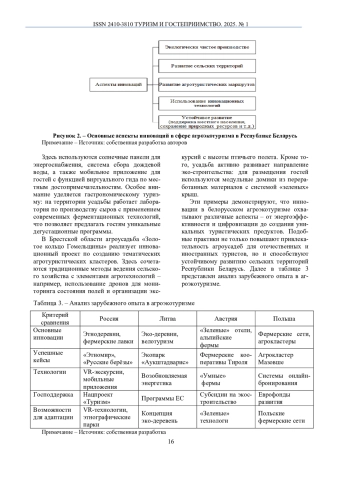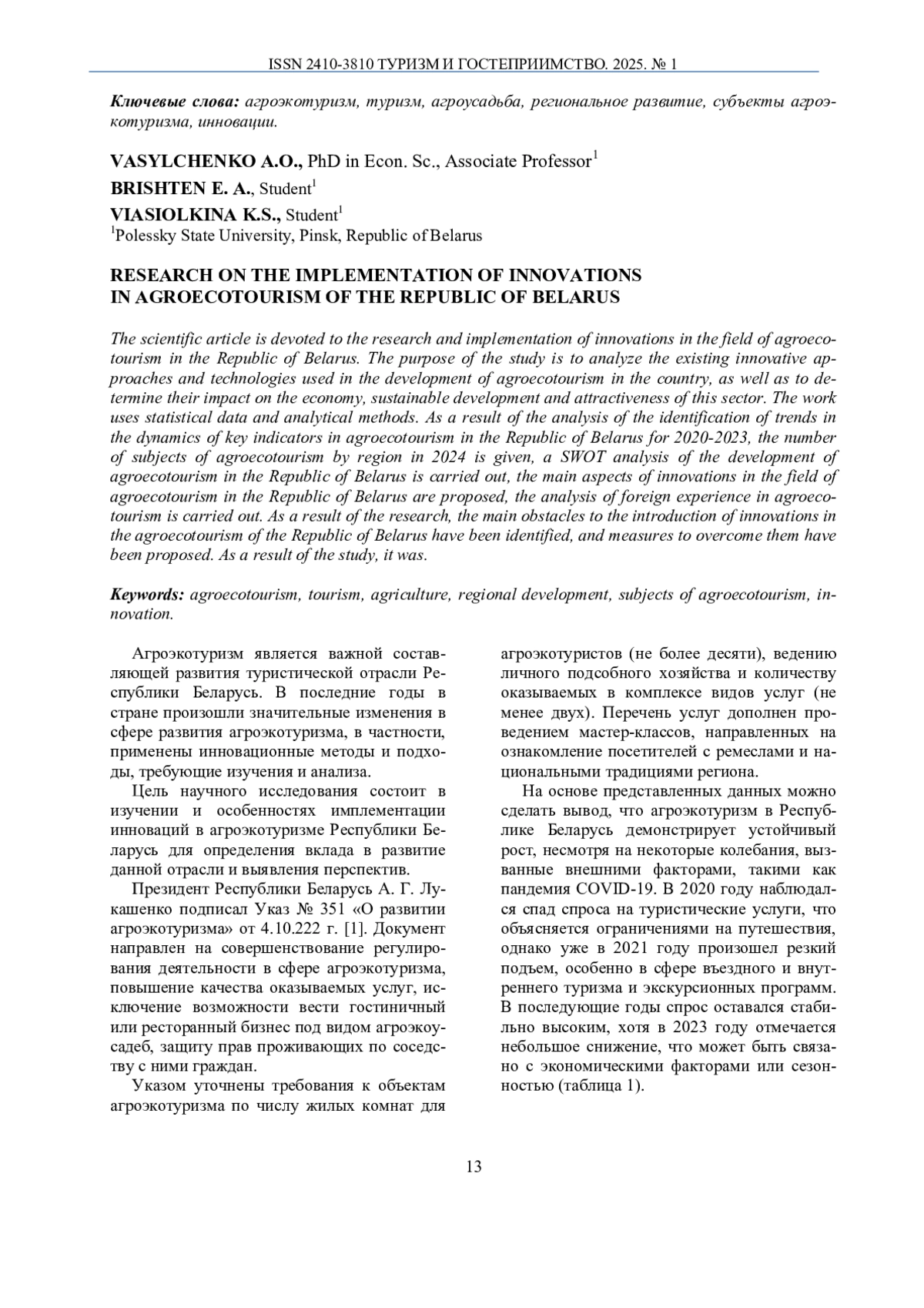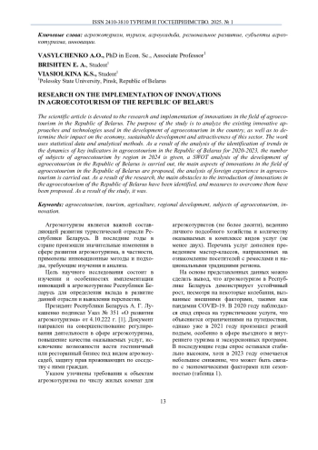 Научная статья посвящена исследованию имплементации инноваций в сфере агроэкотуризма в Республике Беларусь. Целью исследования является анализ существующих инновационных подходов и технологий, применяемых в развитии агроэкотуризма в стране, а также определение их влияния на экономику, устойчивое развитие и привлекательность данного сектора. В работе используются статистические данные и аналитические методы. В результате анализа выявления тенденции развития динамики ключевых показателей в агроэкотуризме в Республике Беларусь за 2020-2023 гг. приведено число субъектов агроэкотуризма по областям в 2024 г., проведен SWOTанализ развития агроэкотуризма в Республике Беларусь, предложены основные аспекты инноваций в сфере агроэкотуризма в Республике Беларусь, проведен анализ зарубежного опыта в агроэкотуризме. В результате исследования выялены основные препятствия для внедрения инноваций в агроэкотуризм Республики Беларусь, предложены меры по их преодолению. В результате исследования было установлено, что в Республике Беларусь происходит активное развитие инноваций в агроэкотуризме, что способствует улучшению услуг, привлекательности для туристов и устойчивому развитию данной сферы.