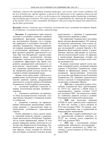 8. Риджабеков, Н. Ч. Проблемы территориальной организации экологического туризма в горных условиях Таджикистана / Н. Ч. Риджабеков, Р. Диловаров // Вестник Таджикского национального университета. -2024. - №. 11. - С. 53-59.