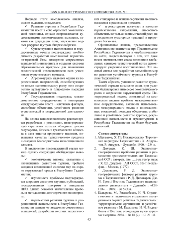 4. Кадырова, М., Риджабеков, Н. Ч. Стратегическое и тактическое управление экотуризмом в горных регионах Таджикистана: территориальная организация и устойчивое развитие / М. Кадырова, Н. Ч. Риджабеков // Вестник ассоциации вузов туризма и сервиса. 2024. - № 18 (2). - С. 21-31.