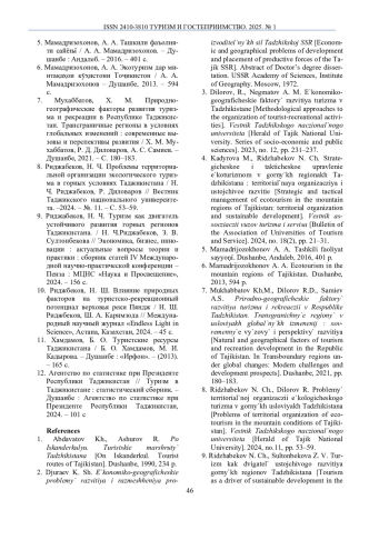 10. Риджбеков, Н. Ш. Влияние природных факторов на туристско-рекреационный потенциал верховья реки Пяндж / Н. Ш. Риджбеков, Ш. А. Каримзода // Международный научный журнал “Endless Light in Science”, Астана, Казахстан, 2024. - 45 с.
