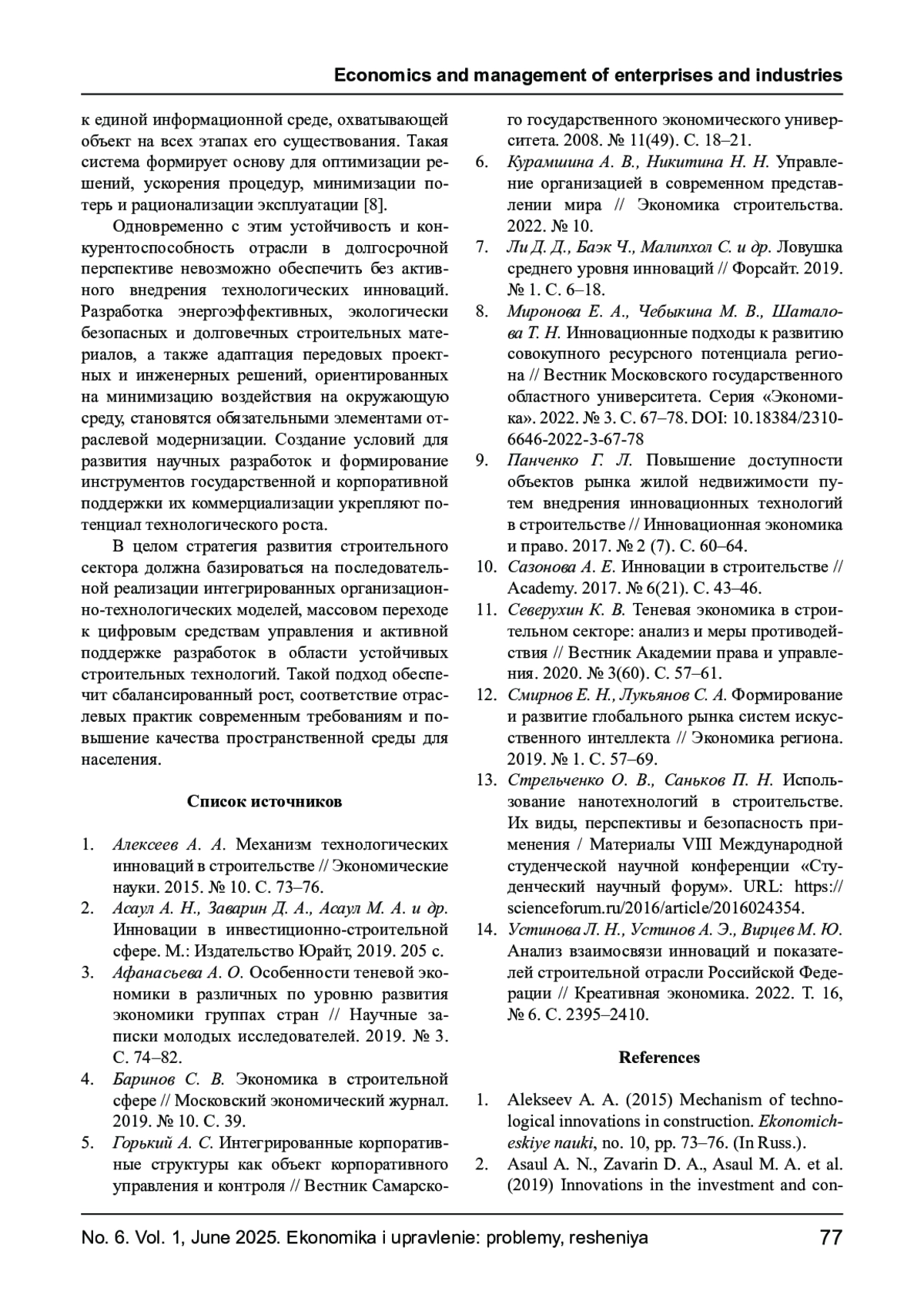 1. Алексеев А. А. Механизм технологических инноваций в строительстве // Экономические науки. 2015. № 10. С. 73-76.