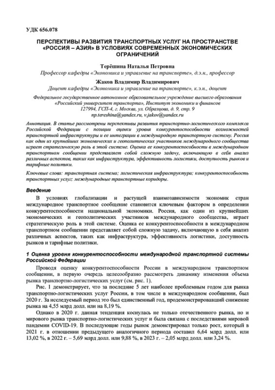 В статье рассмотрены перспективы развития транспортно-логистического комплекса Российской Федерации с позиции оценки уровня конкурентоспособности возможностей транспортной инфраструктуры и ее интеграции в международную транспортную систему. Россия как один из крупнейших экономических и геополитических участников международного сообщества играет стратегическую роль в этой системе. Оценка ее конкурентоспособности в международном транспортном сообщении представляет собой сложную задачу, включающую в себя анализ различных аспектов, таких как инфраструктура, эффективность логистики, доступность рынков и тарифные политики.