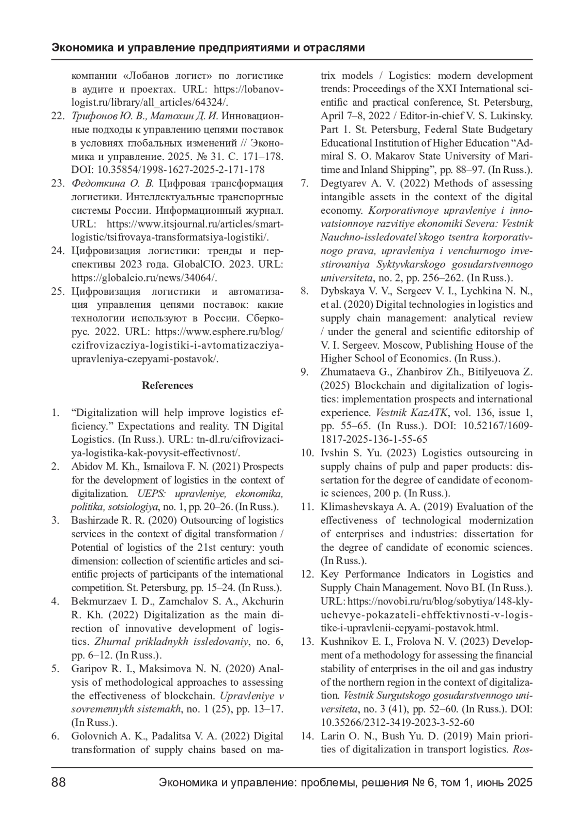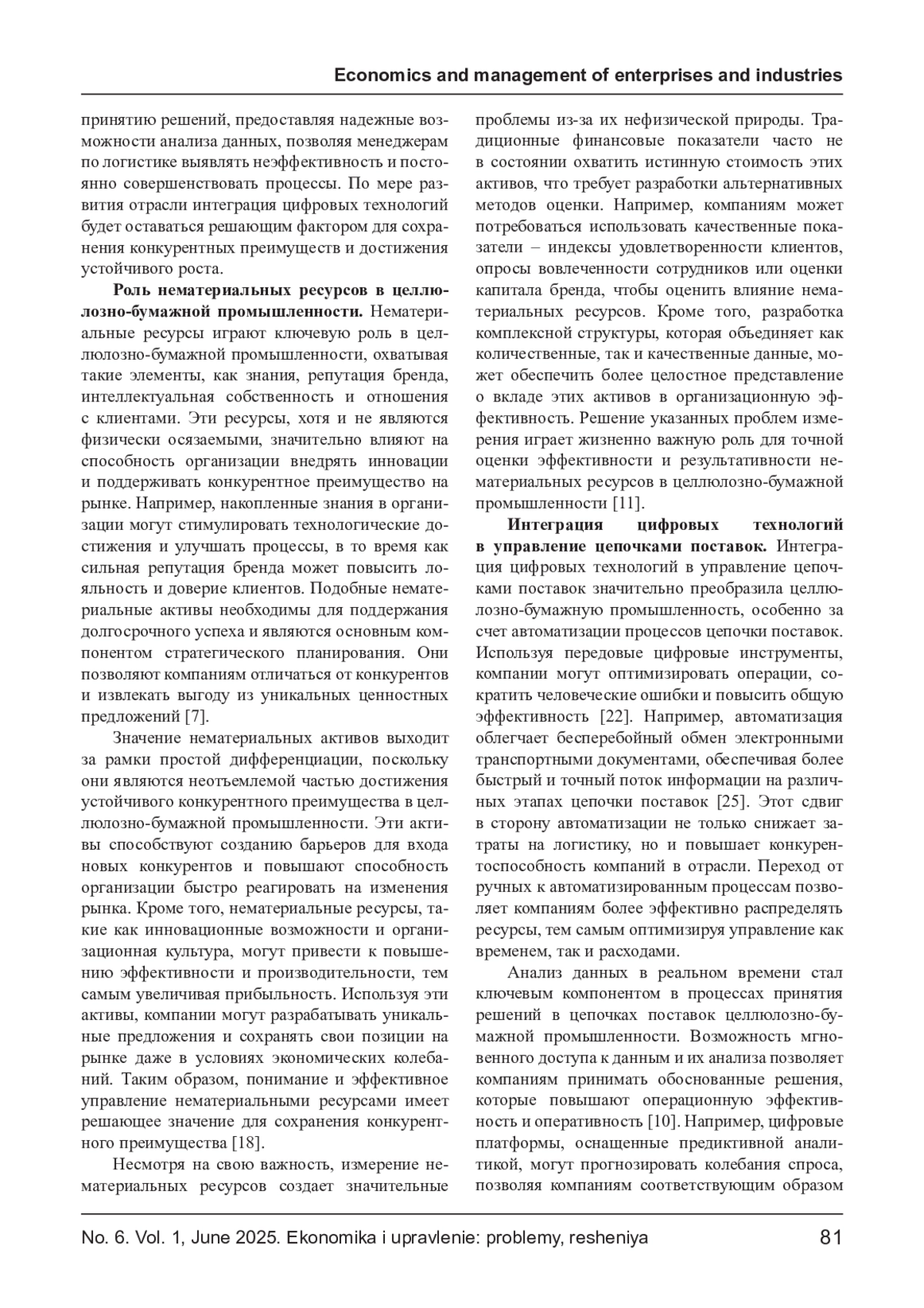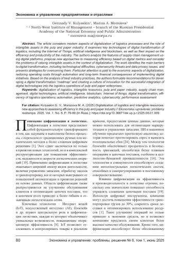 КУЛЯСКИН Г. В., МОРОЗОВА М. А. ЦИФРОВИЗАЦИЯ ЛОГИСТИКИ И НЕМАТЕРИАЛЬНЫЕ РЕСУРСЫ: НОВЫЕ ПОДХОДЫ К ОЦЕНКЕ ЭФФЕКТИВНОСТИ В ЦЕЛЛЮЛОЗНО-БУМАЖНОЙ ПРОМЫШЛЕННОСТИ // ЭКОНОМИКА И УПРАВЛЕНИЕ: ПРОБЛЕМЫ, РЕШЕНИЯ. 2025. ТОМ 1 № 6