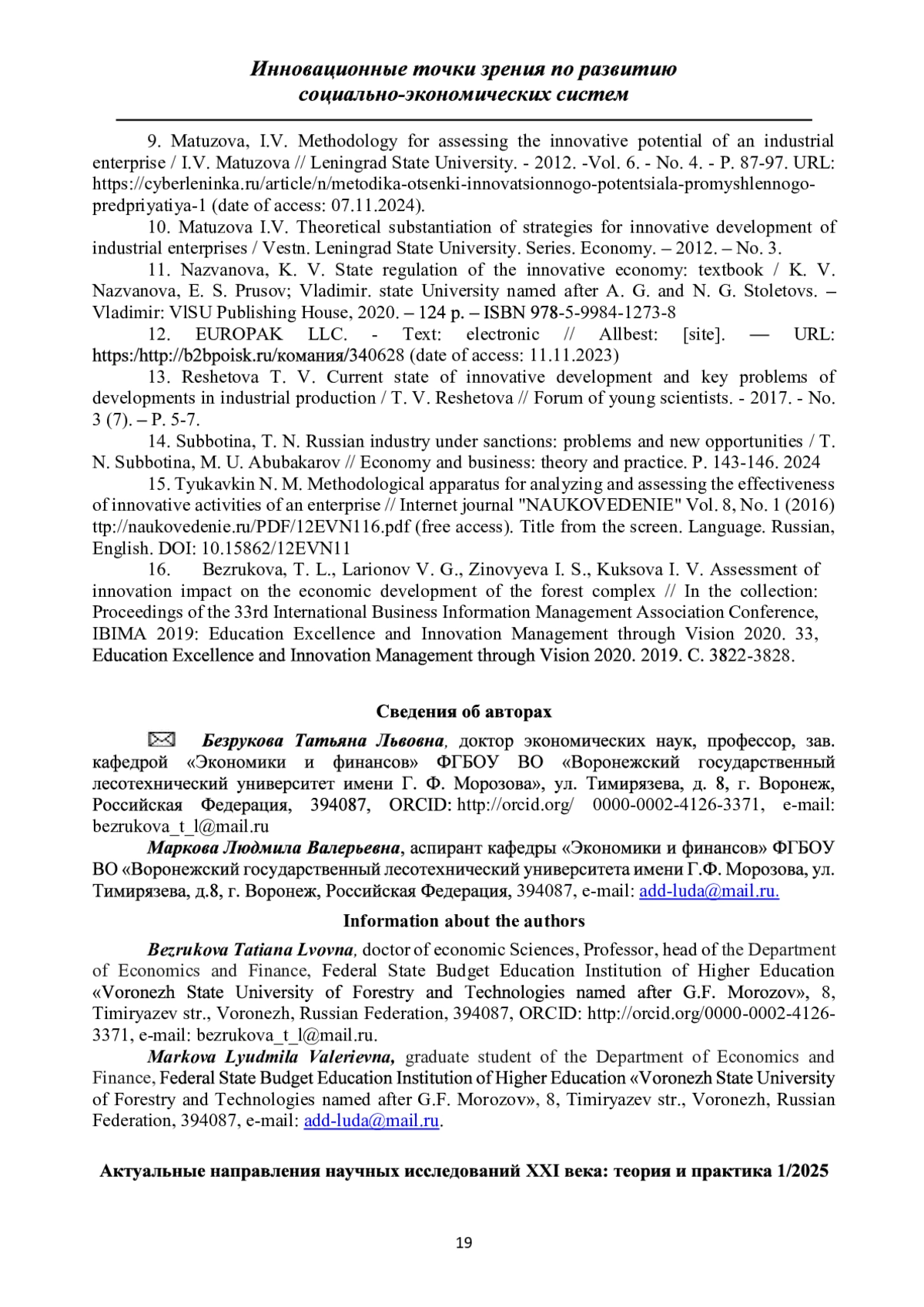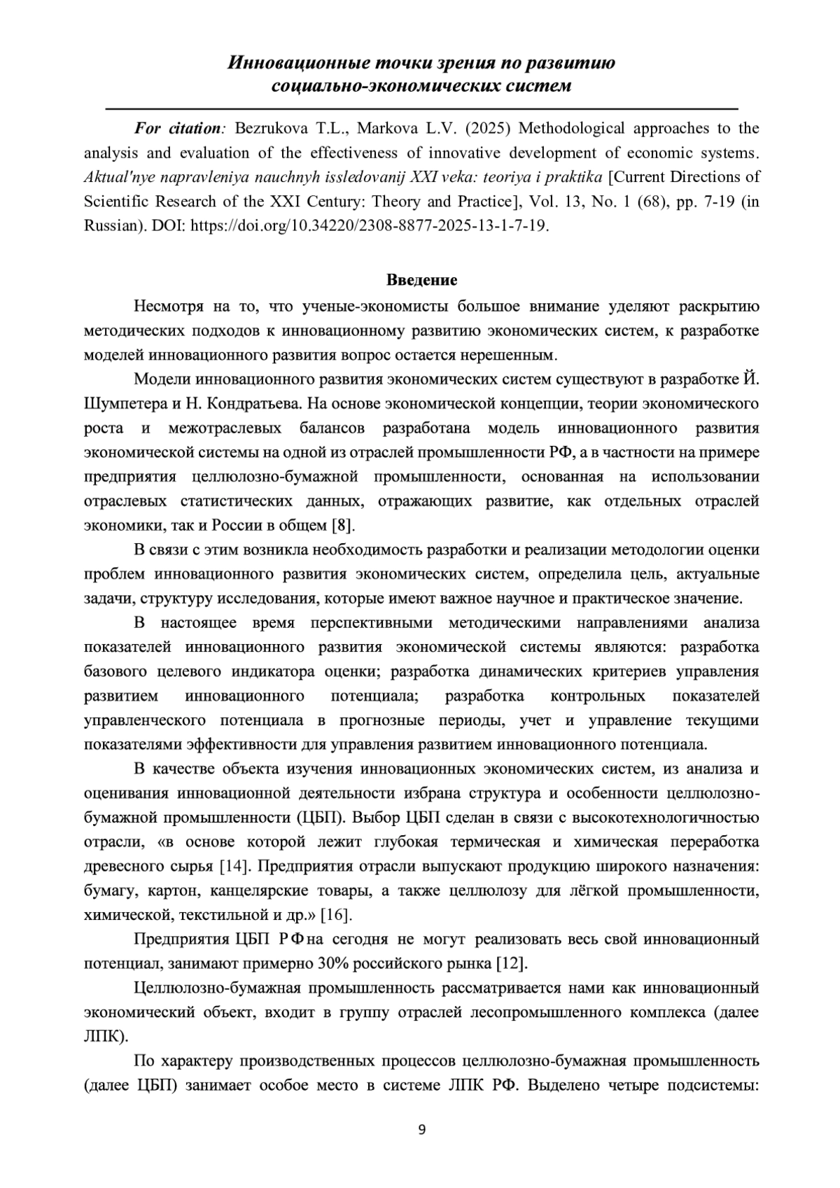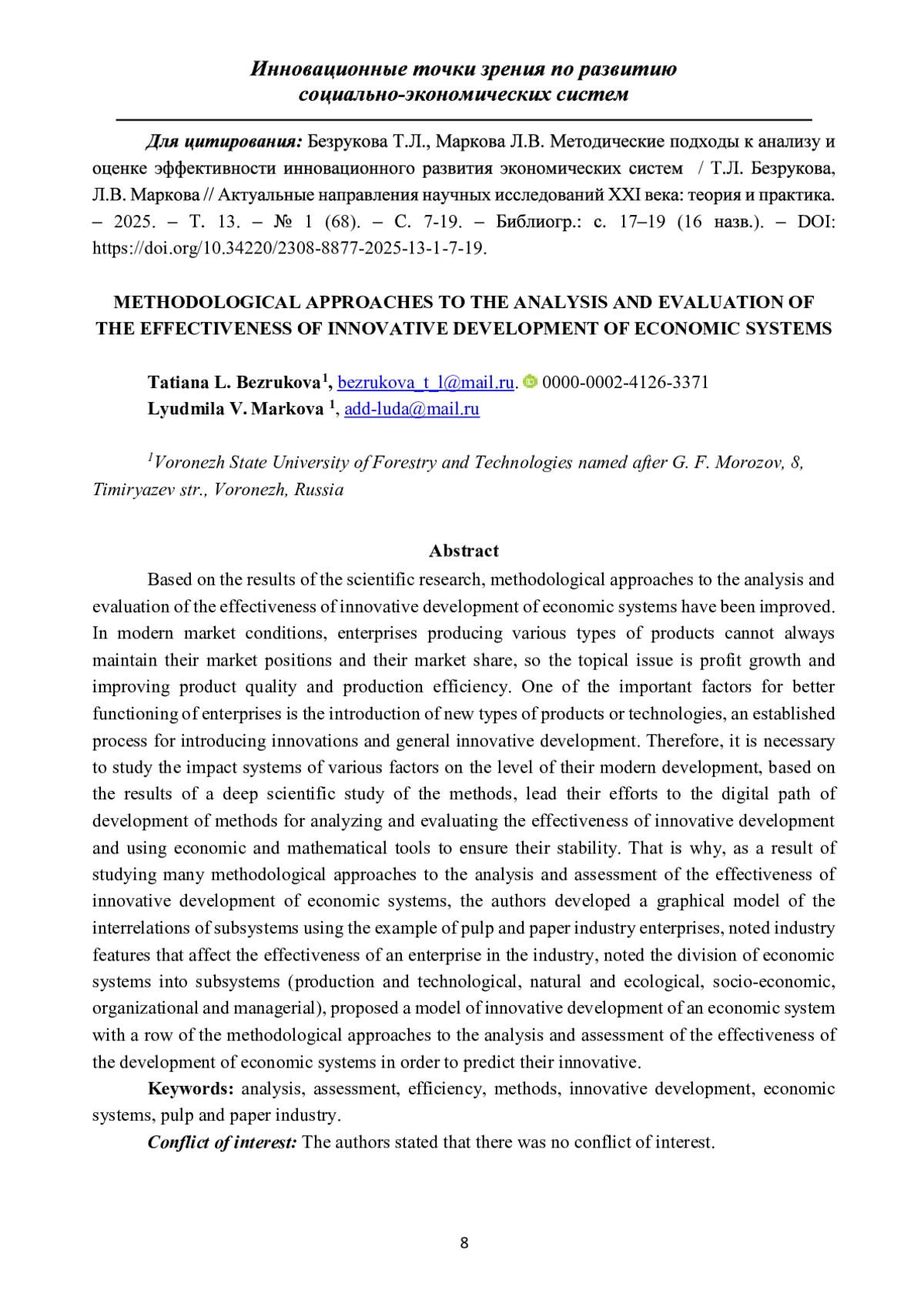 БЕЗРУКОВА Т. Л., МАРКОВА Л. В. МЕТОДИЧЕСКИЕ ПОДХОДЫ К АНАЛИЗУ И ОЦЕНКЕ ЭФФЕКТИВНОСТИ ИННОВАЦИОННОГО РАЗВИТИЯ ЭКОНОМИЧЕСКИХ СИСТЕМ // АКТУАЛЬНЫЕ НАПРАВЛЕНИЯ НАУЧНЫХ ИССЛЕДОВАНИЙ XXI ВЕКА: ТЕОРИЯ И ПРАКТИКА. 2025. Т. 13 № 1 (68)