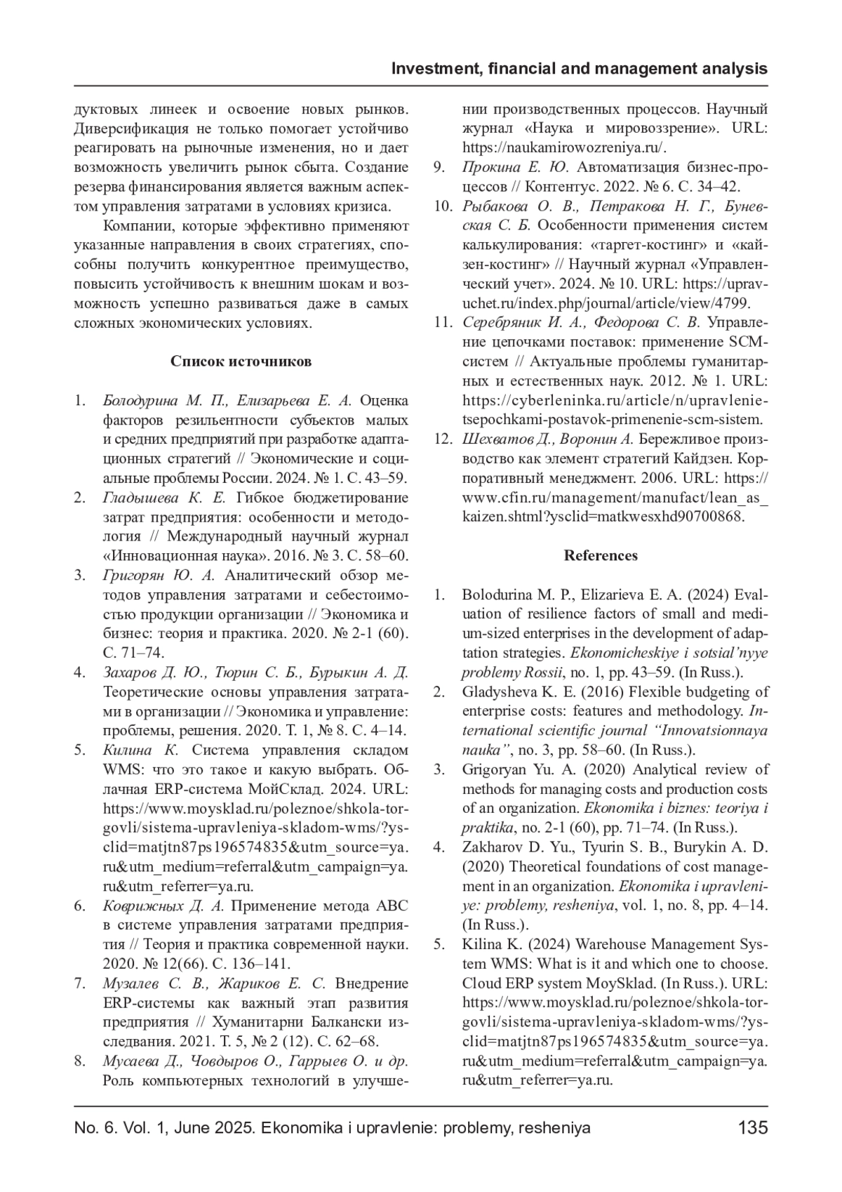 3. Григорян Ю. А. Аналитический обзор методов управления затратами и себестоимостью продукции организации // Экономика и бизнес: теория и практика. 2020. № 2-1 (60). С. 71-74. EDN: WMQPNF