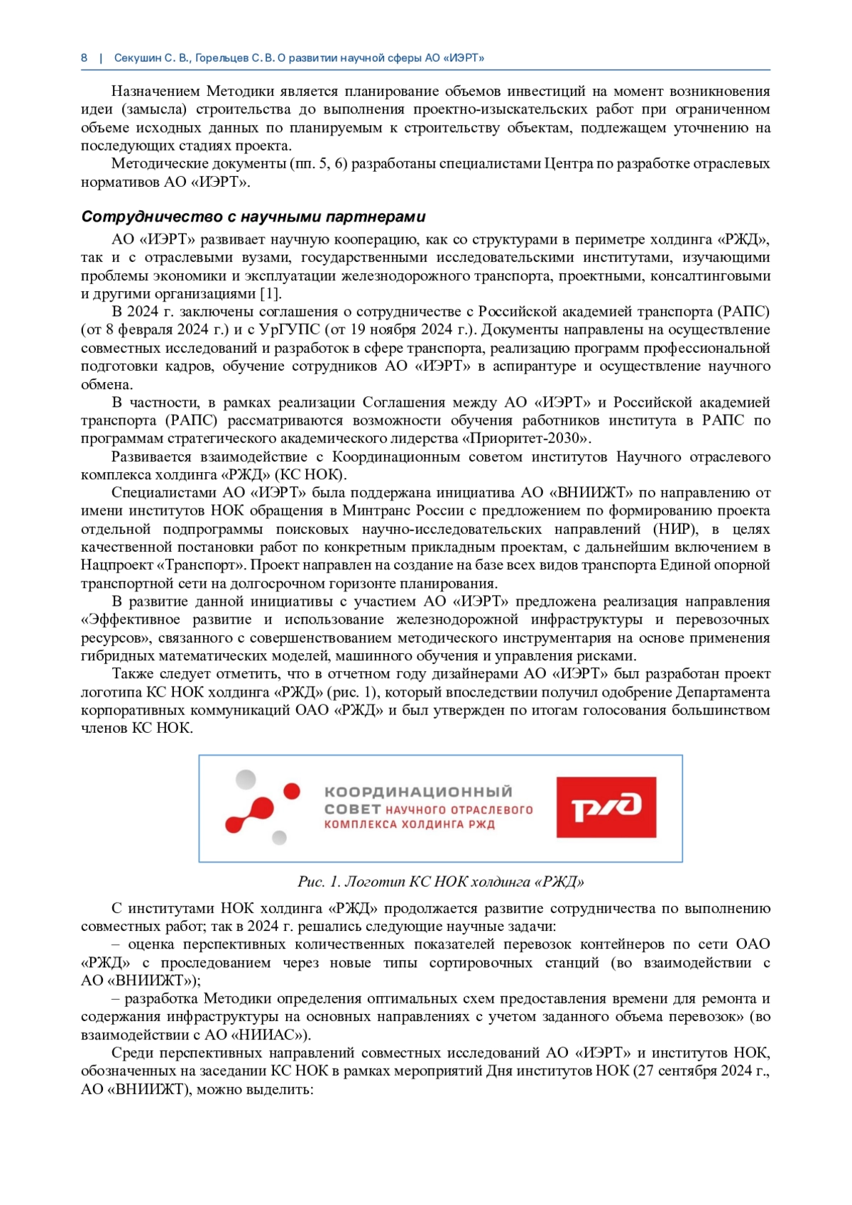 В статье отражены результаты развития научной сферы АО «ИЭРТ» в 2024 г., включая развитие методического и цифрового инструментария, деятельности ученого совета, сотрудничества с научными партнерами, расширение направлений подготовки кадров высшей квалификации и др. Освещена целенаправленная работа, благодаря которой корпоративное издание «Бюллетень ученого совета АО «ИЭРТ» в 2024 г. достигло уровня наукометрических показателей ведущих отраслевых научных журналов (двухлетний импакт-фактор составил 0,69).