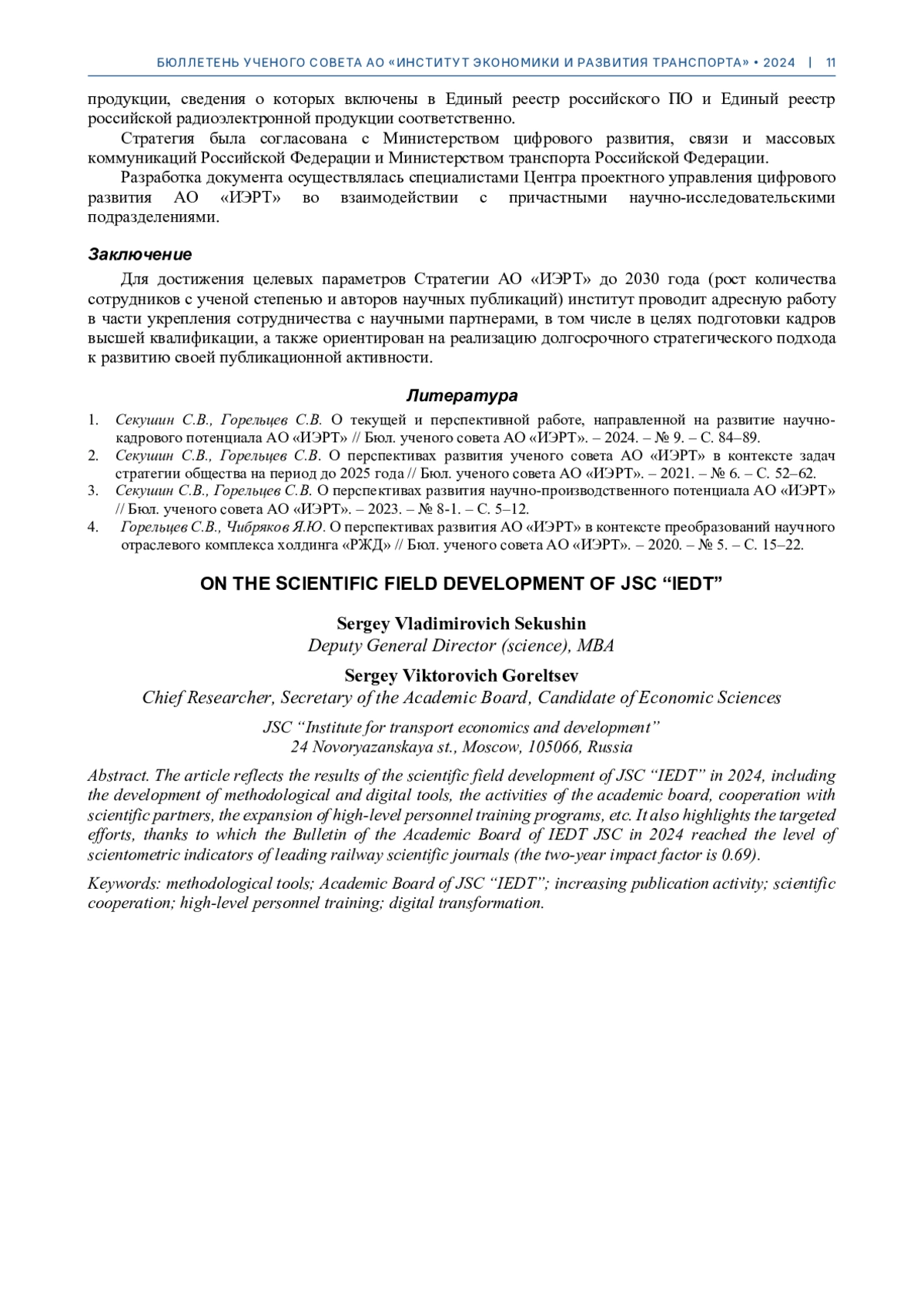 4. Горельцев С.В., Чибряков Я.Ю. О перспективах развития АО “ИЭРТ” в контексте преобразований научного отраслевого комплекса холдинга “РЖД” // Бюл. ученого совета АО “ИЭРТ”. - 2020. - № 5. - С. 15-22.