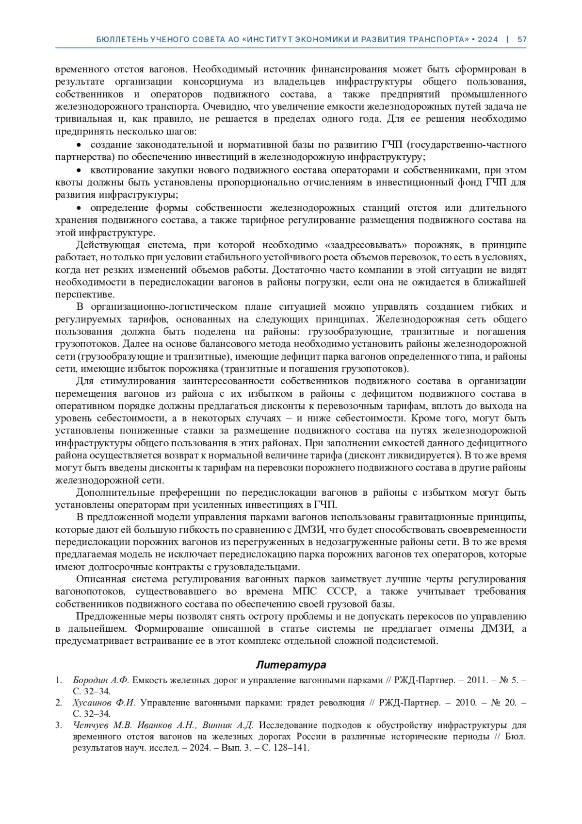 3. Четчуев М.В. Иванков А.Н., Винник А.Д. Исследование подходов к обустройству инфраструктуры для временного отстоя вагонов на железных дорогах России в различные исторические периоды // Бюл. результатов науч. исслед. - 2024. - Вып. 3. - С. 128-141.