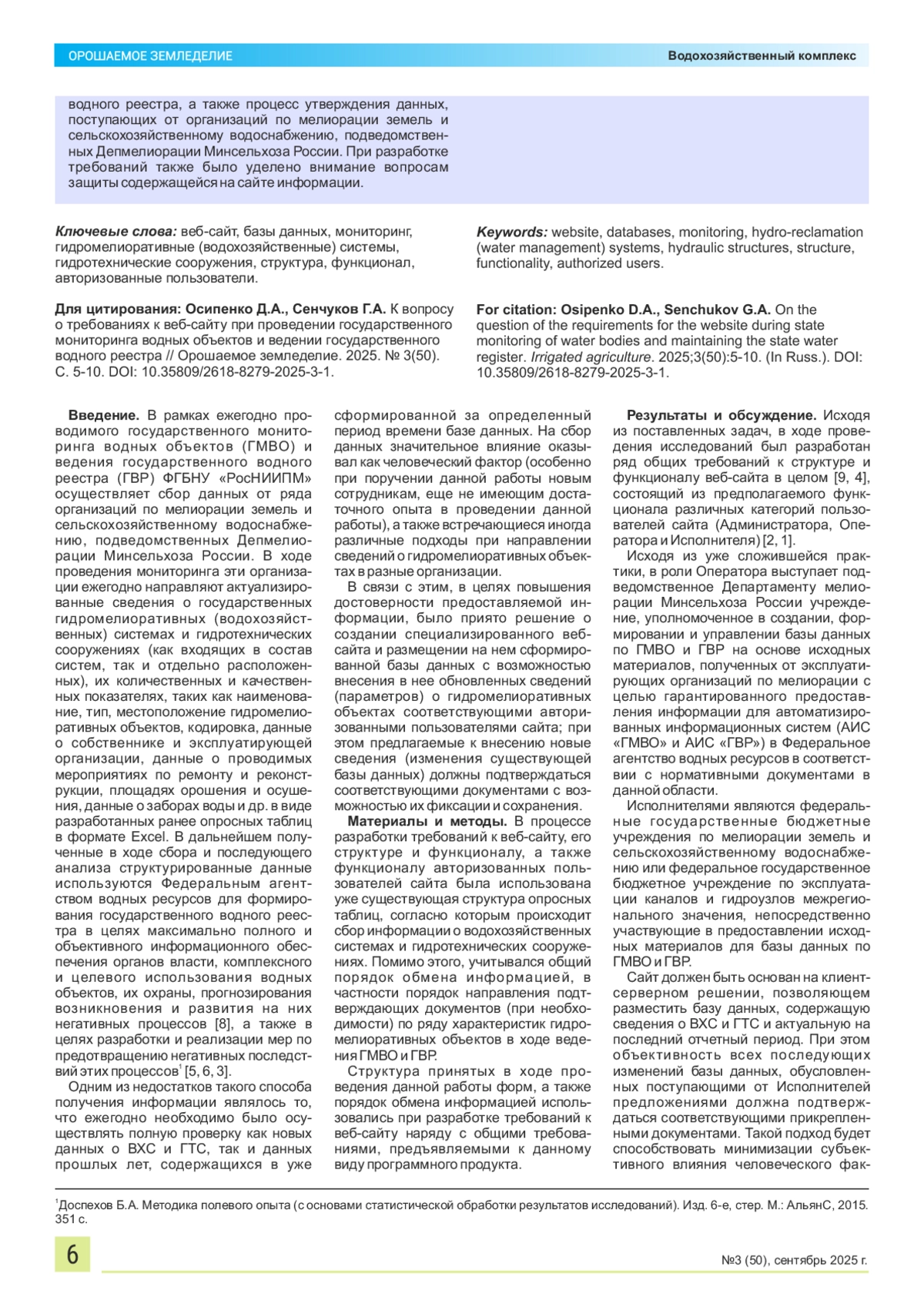 ОСИПЕНКО Д. А., СЕНЧУКОВ Г. А. К ВОПРОСУ О ТРЕБОВАНИЯХ К ВЕБ-САЙТУ ПРИ ПРОВЕДЕНИИ ГОСУДАРСТВЕННОГО МОНИТОРИНГА ВОДНЫХ ОБЪЕКТОВ И ВЕДЕНИИ ГОСУДАРСТВЕННОГО ВОДНОГО РЕЕСТРА // ОРОШАЕМОЕ ЗЕМЛЕДЕЛИЕ. 2025. № 3 (50)