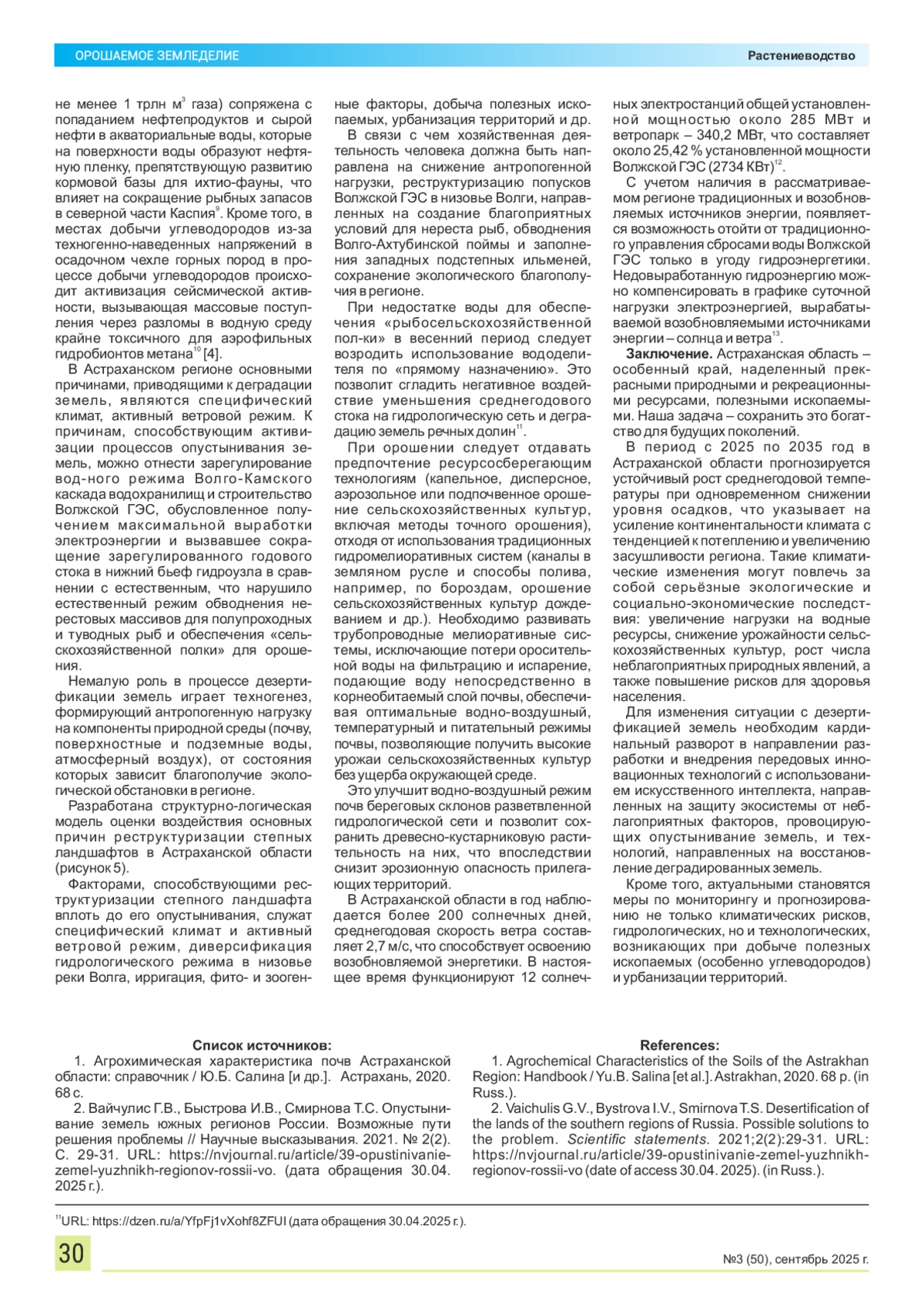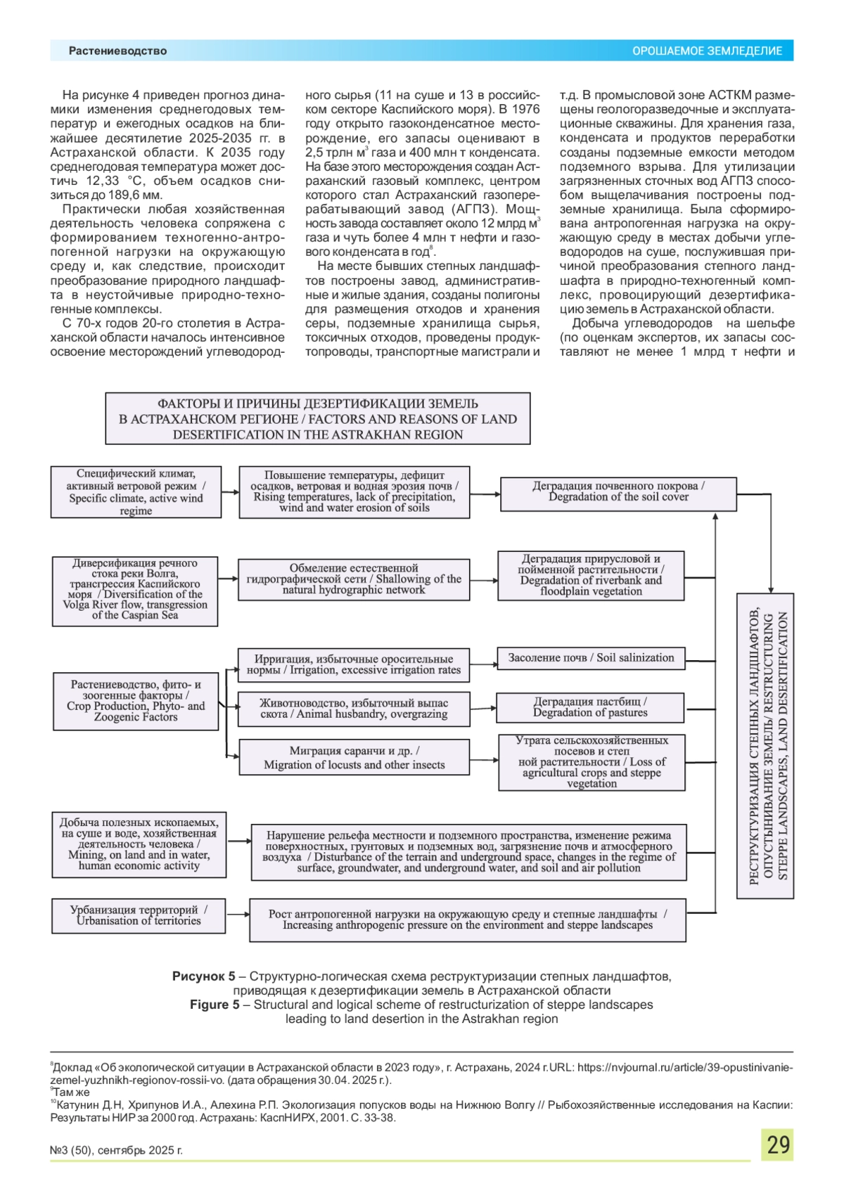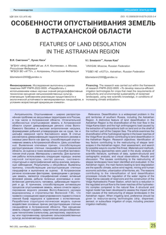 Опустынивание – широко распространённая проблема на засушливых территориях юга России, в том числе в Астраханской области. Отличительной особенностью опустынивания земель в Астраханской области служит диверсификация речного стока ВолгоКамского бассейна и высокая антропогенная нагрузка, формируемая добычей углеводородов как на суше, так и шельфе северной части Каспийского моря. В статье рассмотрена диверсификация гидрологического режима в низовье реки Волги как фактор, способствующий опустыниванию земель в Астраханской области. Цель исследований. Выявление ключевых причин, способствующих реструктуризации степных ландшафтов в Астраханской области, их оценка и поиск возможных способов противостояния этой угрозе. Материалы и методы. Для выполнения работы использовались следующие подходы: анализ научной литературы, синтез данных, системноструктурный и картографический метод анализа, визуальные наблюдения. Результаты и обсуждение. Выявлены причины, способствующие реструктуризации степных ландшафтов и выполнена их оценка. В Астраханском регионе основными факторами, приводящими к деградации земель, являются специфический климат, активный ветровой режим, добыча полезных ископаемых и хозяйственная деятельность человека, урбанизация территорий и др. К причинам, способствующим активизации процессов опустынивания земель, можно отнести зарегулирование водного режима Волго-Камского каскада водохранилищ и строительство Волжской ГЭС, что привело к сокращению зарегулированного годового стока в нижний бьеф гидроузла в сравнении с естественным. Разработана структурно-логическая модель оценки воздействия основных причин реструкторизации степных ландшафтов в Астраханской области. При орошении земель следует отдавать предпочтение ресурсосберегающим технологиям (капельному, дисперсному, аэрозольному или подпочвенному орошению сельскохозяйственных культур, включая методы точного орошения).