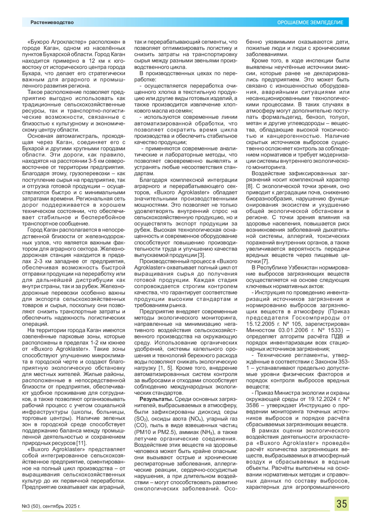 Необходимость обеспечения устойчивого развития агропромышленного комплекса с учётом экологических факторов обусловливает проведение комплексного исследования природно-климатических условий, производственных характеристик и экологического воздействия деятельности агрокластера «Buxoro Agroklaster». Регулярные мероприятия по озеленению и созданию защитных зон вокруг производственных объектов способствуют улучшению плодородия почв мелиорированных агроландшафтов. Использование органических удобрений, системы капельного орошения и технологии бережного расхода воды позволяют снижать экологическую нагрузку. Кроме того, внедрение автоматизированных систем контроля за выбросами и отходами способствует соблюдению международных экологических стандартов. Материалы и методы. Расчёты выполнены на основании нормативных методик и справочных данных по составу выбросов, характерных для агропромышленного производства. Результаты и выводы. Анализ деятельности предприятия отметил наличие неучтённых источников эмиссии и несанкционированных сбросов сточных вод, что свидетельствует о недостаточной организации внутреннего экологического мониторинга и контроле. Последствия данных нарушений выражаются в деградации почв, загрязнении атмосферного воздуха и водных ресурсов, что оказывает негативное воздействие как на экосистемы региона, так и на здоровье населения. Полученные данные могут быть использованы для сохранения и улучшения плодородия почв мелиорированных агроландшафтов в зоне воздействия «Buxoro Agroklaster», что позволит не только минимизировать негативное воздействие на окружающую среду, но и обеспечить устойчивое развитие предприятия с учетом социально-экономических и природоохранных аспектов. Рекомендации по внедрению инновационных технологий и совершенствованию системы экологического менеджмента будут способствовать достижению баланса между промышленным ростом и сохранением природных ресурсов региона.