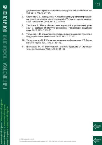 7. Стоянова О. В., Васицына А. И. Особенности управления ресурсами проектов в сфере нанотехнологий // Успехи в химии и химической технологии. 2011. №13. С. 47-49.
