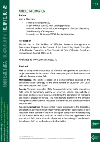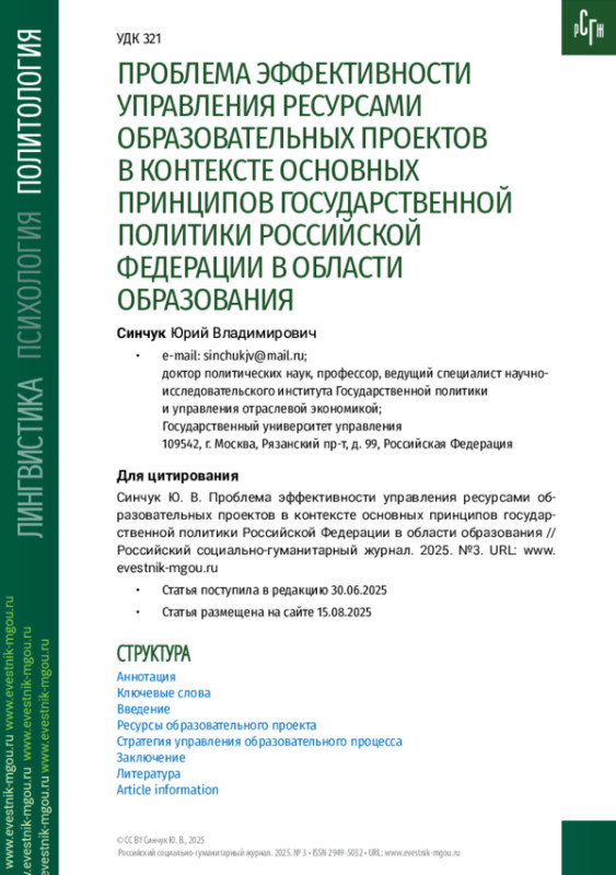 Цель. Проанализировать значимость эффективного управления ресурсами образовательных проектов в контексте основных принципов государственной политики России в области образования.