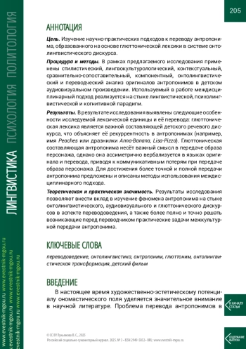 Результаты. В результате исследования выявлены следующие особенности исследуемой лексической единицы и её перевода: глюттоническая лексика является важной составляющей детского речевого дискурса, что объясняет её рекуррентность в антропонимах (например, имя Peaches или дразнилки Anna-Banana, Lisa-Pizza). Глюттоническая составляющая антропонима несёт важный смысл в передаче образа персонажа, однако она ассиметрично вербализуется в языках оригинала и перевода, приводя к коммуникативным потерям при передаче образа персонажа. Для достижения более точной и полной передачи антропонима предложены и описаны методы использования междисциплинарного подхода.