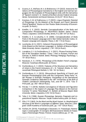6. Гусева А. Е., Мальцев М. А., Шабанова В. П. Антонимические отношения фразеологических соматизмов английского и немецкого языков (на примере фразеологизмов с семантикой “речевая деятельность”) // Вестник Северного (Арктического) федерального университета. Серия: Гуманитарные и социальные науки. 2022. Т. 22. №2. С. 87-95.