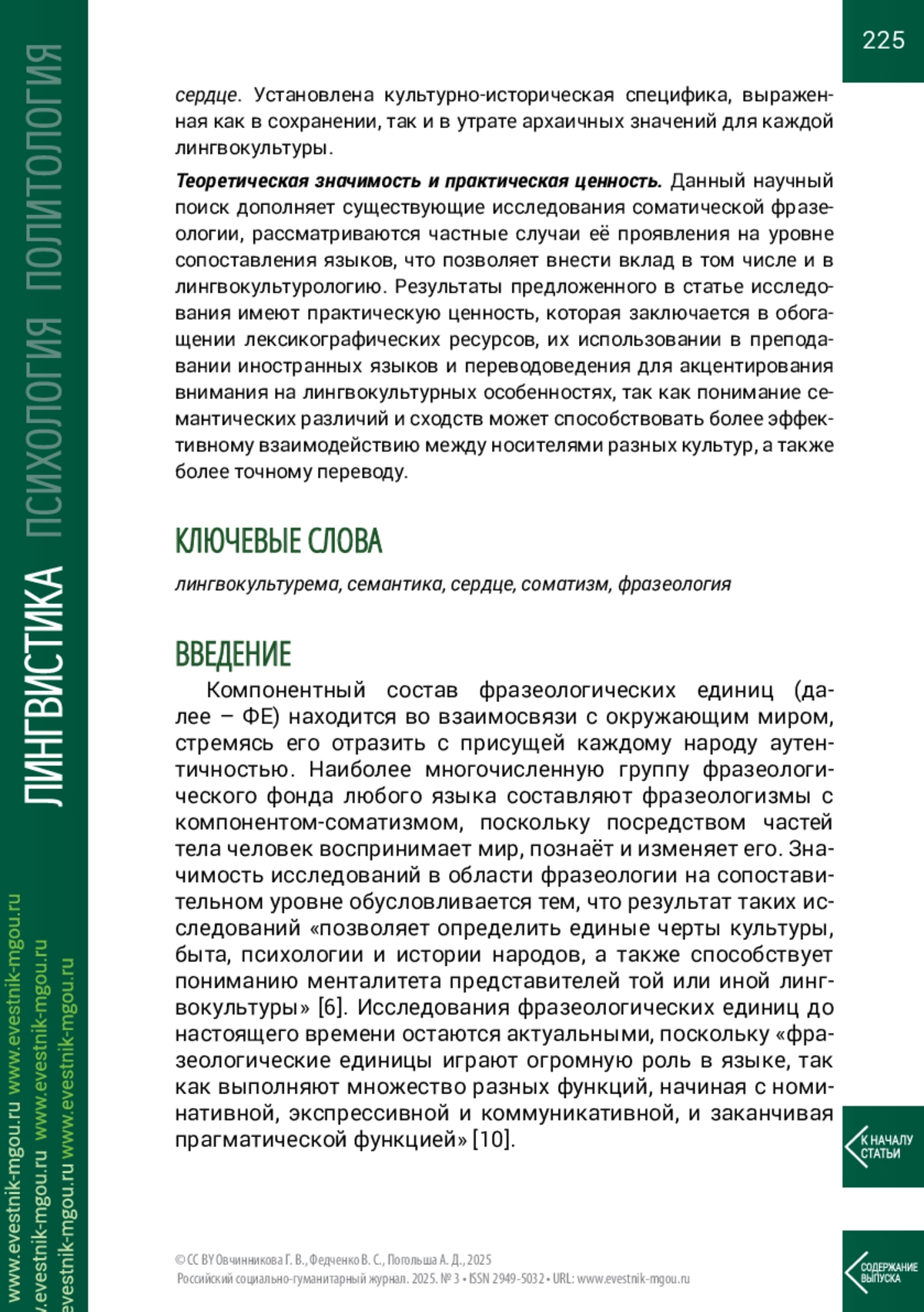 11. Ломакина О. В., Овчинникова Г. В. Фразеообразующий потенциал соматизма сердце / cœur / Herz в русском, французском и немецком языках // Вестник Балтийского федерального университета им. И. Канта. Серия: Филология, педагогика, психология. 2021. №1. С.19-28.