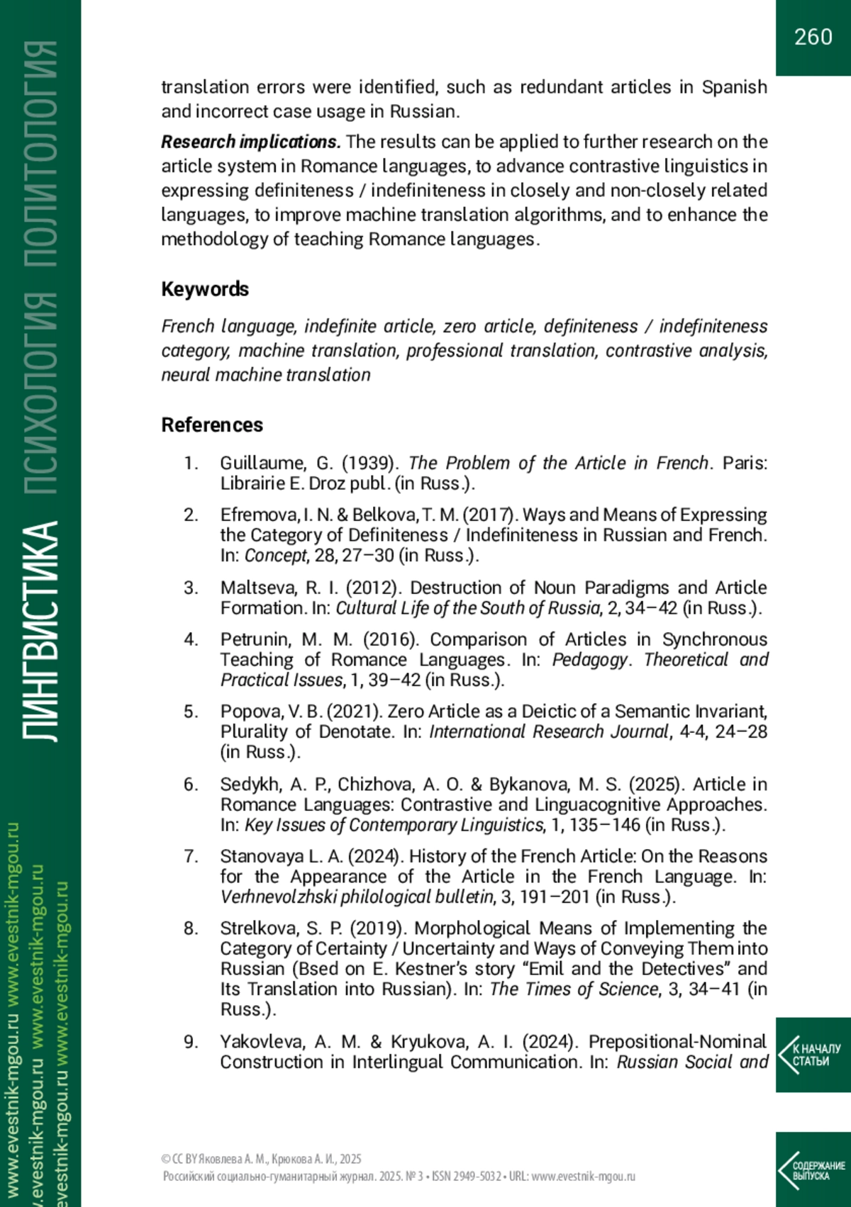 6. Седых А. П., Чижова А. О., Быканова М. С. Артикль в романских языках: контрастивный и лингвокогнитивный подходы // Вопросы современной лингвистики. 2025. №1. С. 135-146.