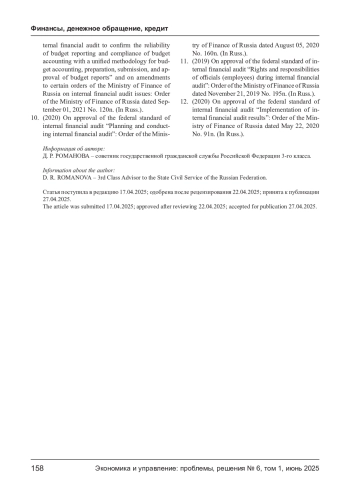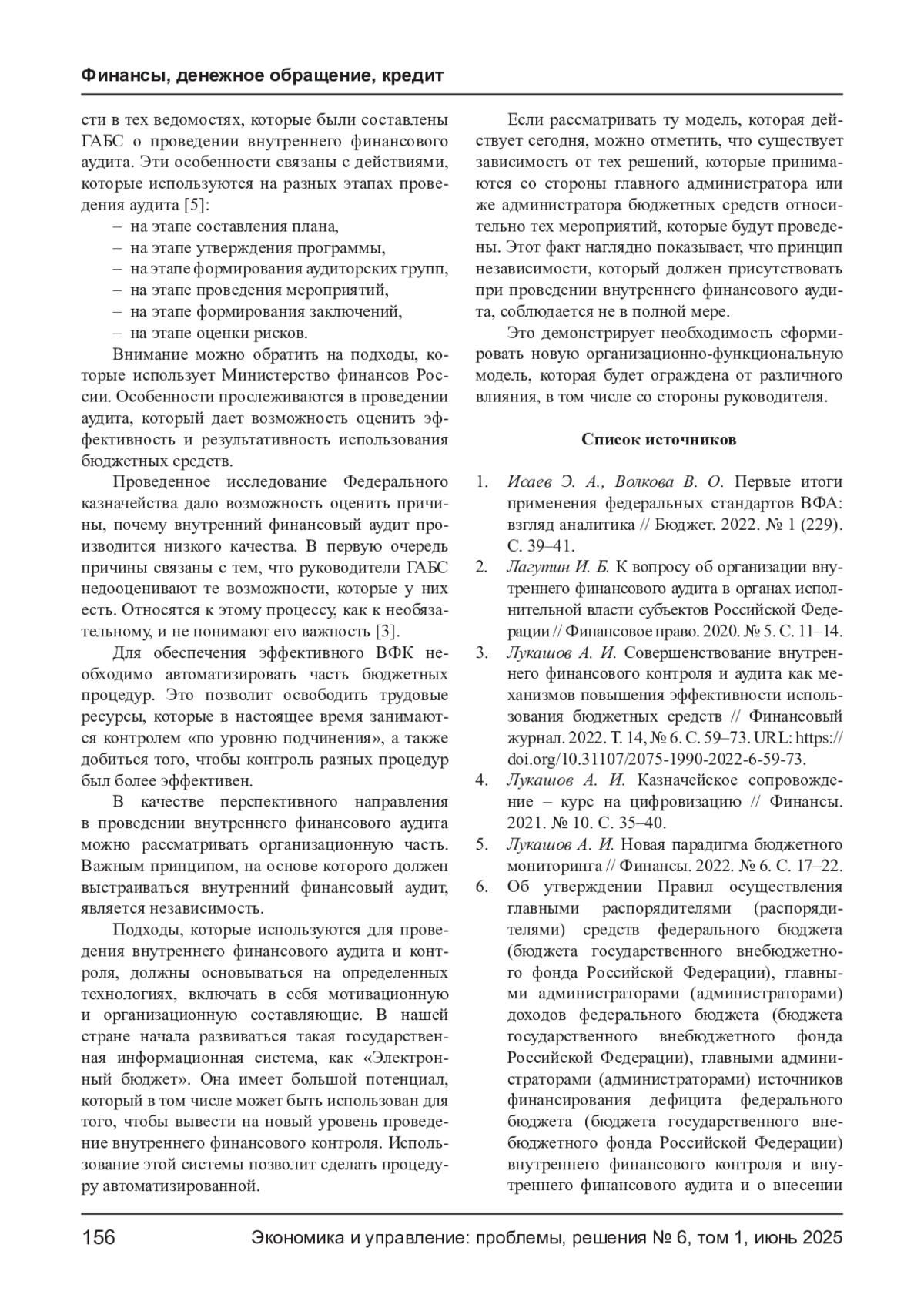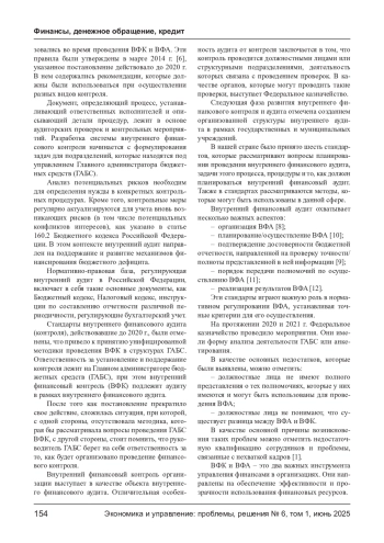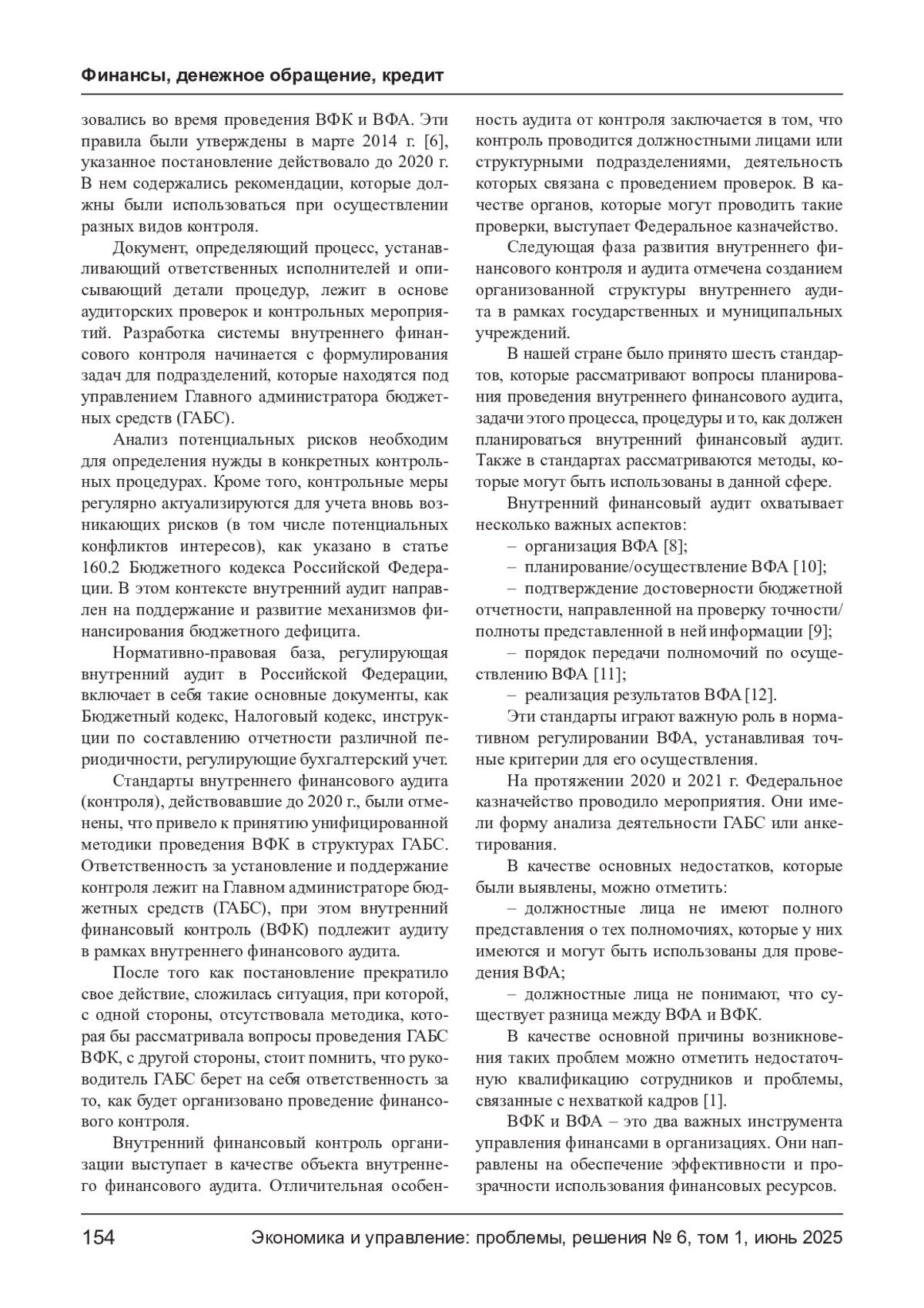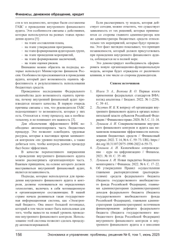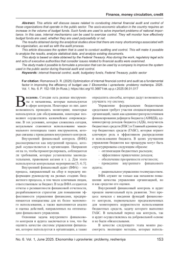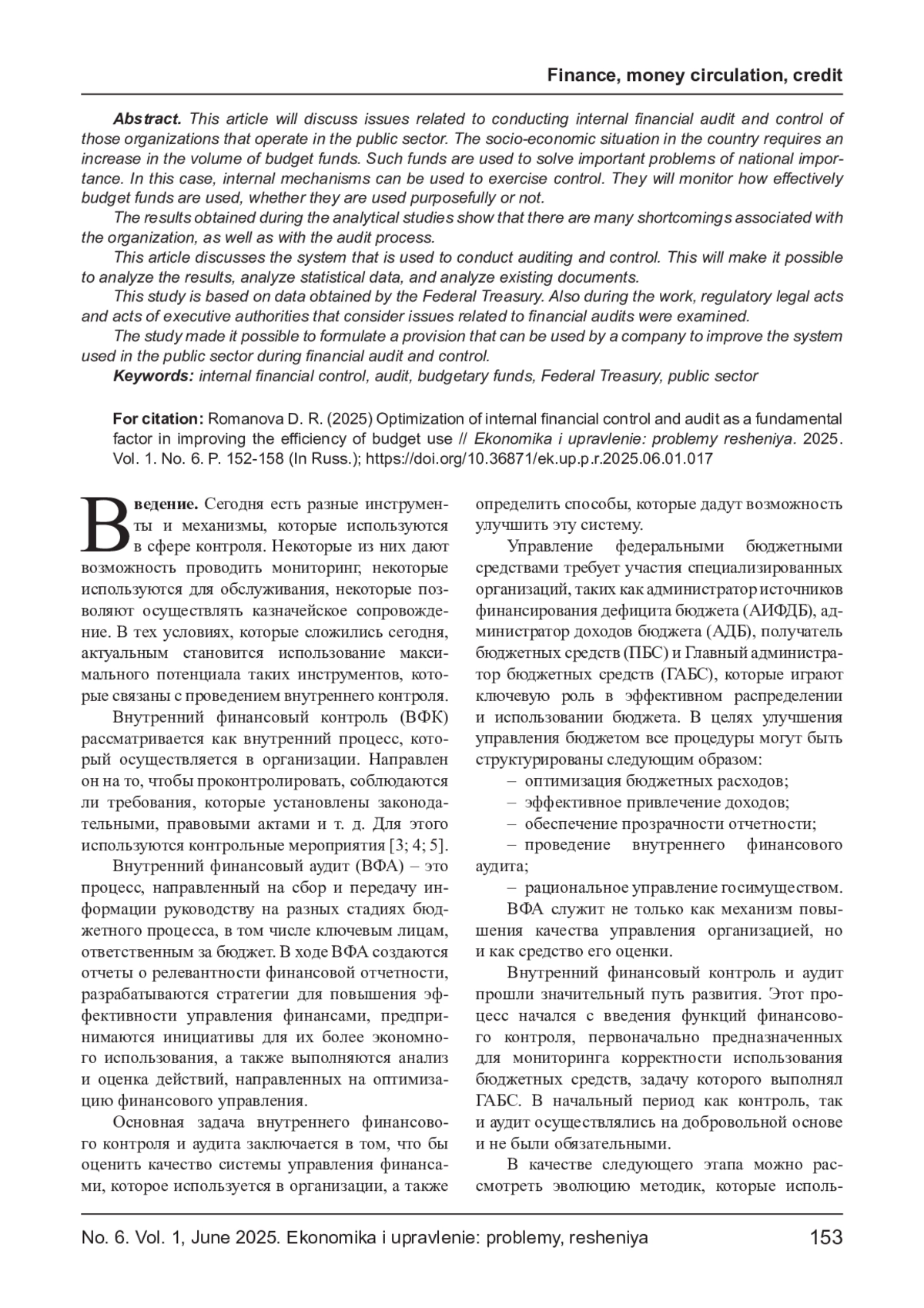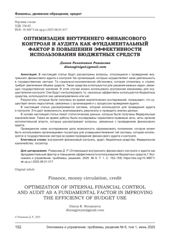 РОМАНОВА Д. Р. ОПТИМИЗАЦИЯ ВНУТРЕННЕГО ФИНАНСОВОГО КОНТРОЛЯ И АУДИТА КАК ФУНДАМЕНТАЛЬНЫЙ ФАКТОР В ПОВЫШЕНИИ ЭФФЕКТИВНОСТИ ИСПОЛЬЗОВАНИЯ БЮДЖЕТНЫХ СРЕДСТВ // ЭКОНОМИКА И УПРАВЛЕНИЕ: ПРОБЛЕМЫ, РЕШЕНИЯ. 2025. ТОМ 1 № 6