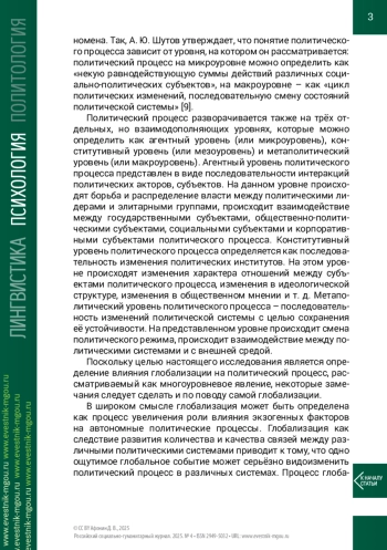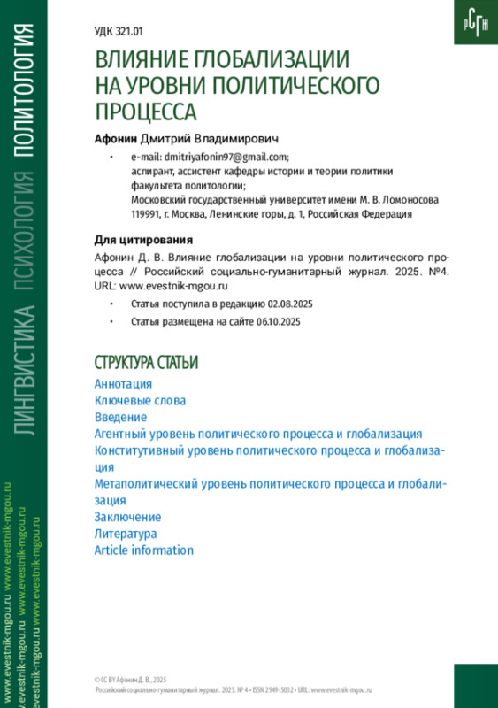 Результаты. Установлено, что на агентном уровне политического процесса влияние глобализации характеризуется через появление новых акторов, влияющих на внутриполитическую ситуацию. На конститутивном уровне политического процесса глобализация приводит к изменениям системы институтов, происходят процесс унификации институтов и обратный ему процесс фрагментации. На метаполитическом уровне процесс глобализации влияет на суверенитет политической системы при появлении новых надсистемных игроков на мировой арене.