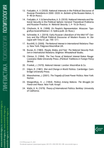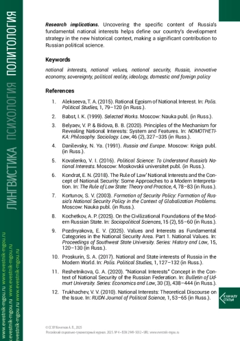 Процедура и методы. В статье анализируются теоретические аспекты и основное содержание национальных интересов России в новых политических условиях. Применяются историко-политологический метод, сравнительный метод, метод анализа и синтеза, метод многостороннего подхода.