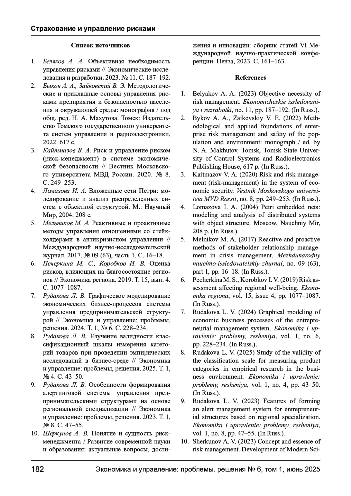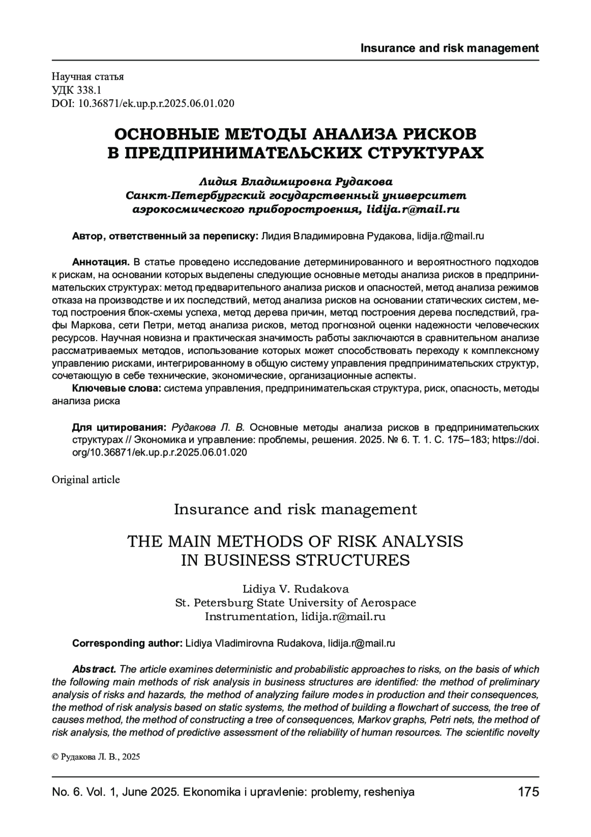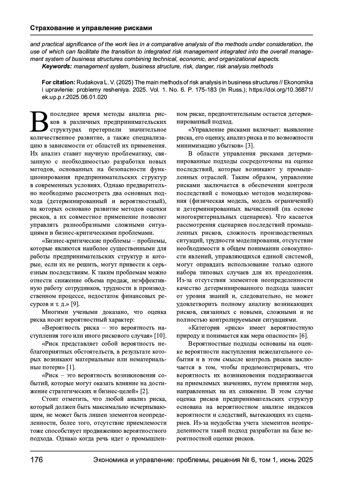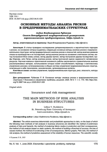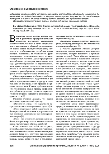 РУДАКОВА Л. В. ОСНОВНЫЕ МЕТОДЫ АНАЛИЗА РИСКОВ В ПРЕДПРИНИМАТЕЛЬСКИХ СТРУКТУРАХ // ЭКОНОМИКА И УПРАВЛЕНИЕ: ПРОБЛЕМЫ, РЕШЕНИЯ. 2025. ТОМ 1 № 6