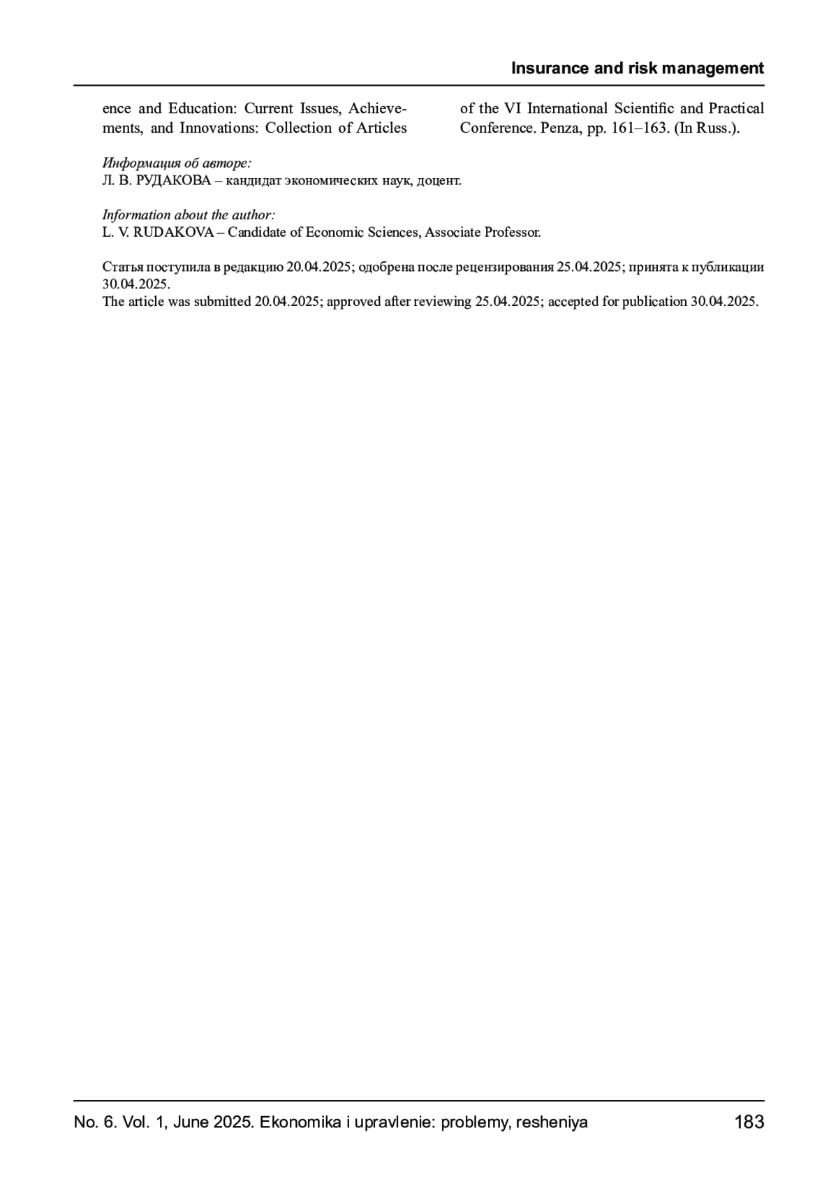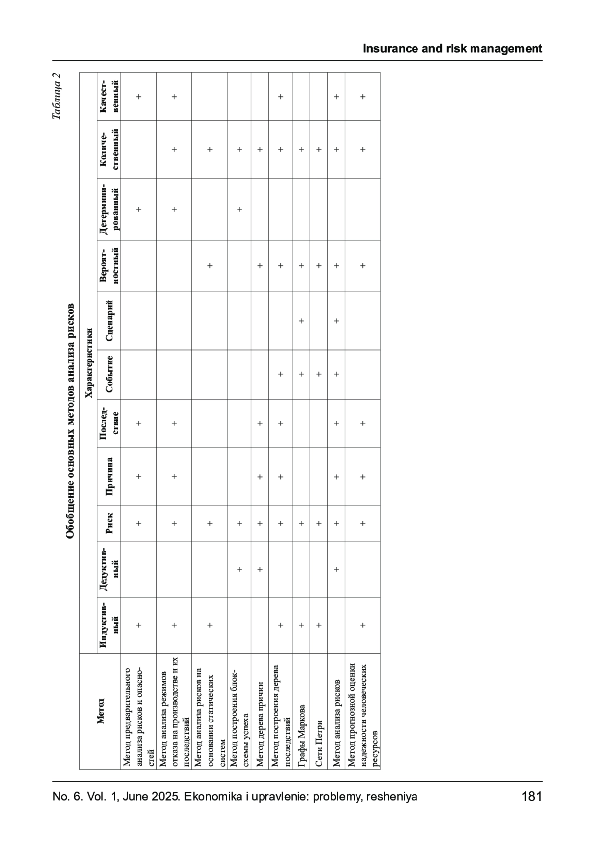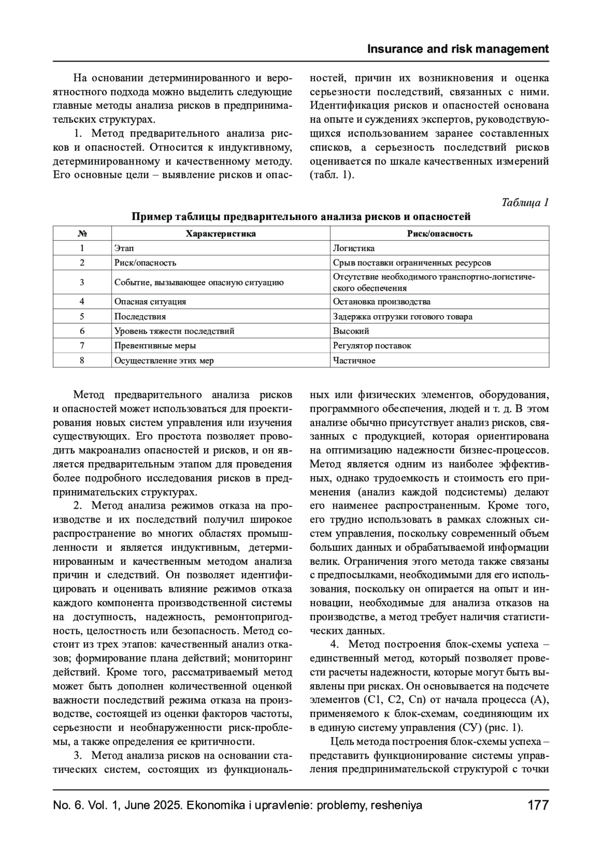 РУДАКОВА Л. В. ОСНОВНЫЕ МЕТОДЫ АНАЛИЗА РИСКОВ В ПРЕДПРИНИМАТЕЛЬСКИХ СТРУКТУРАХ // ЭКОНОМИКА И УПРАВЛЕНИЕ: ПРОБЛЕМЫ, РЕШЕНИЯ. 2025. ТОМ 1 № 6