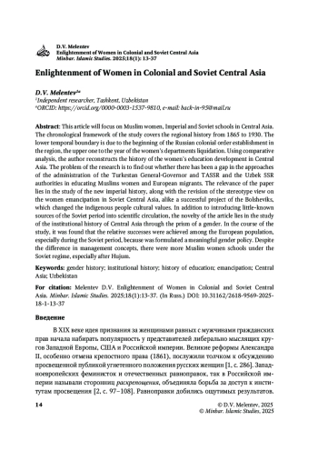 В настоящей статье речь пойдет о женских мусульманских, имперских и советских школах в Средней Азии. Хронологические рамки исследования охватывают историю региона с 1865 по 1930 год. Нижняя темпоральная граница определена началом установления русского колониального порядка в регионе, верхняя – годом ликвидации отделов по работе среди женщин (женотделов). Используя сравнительный анализ, автор производит попытку реконструировать историю развития просвещения женщин в Средней Азии. Проблематика исследования заключается в выяснении, произошел ли разрыв между администрацией Туркестанского генерал-губернаторства и правительством ТАССР и Узбекской ССР в подходах к просвещению мусульманок и европеек-переселенок. Актуальность исследования лежит в плоскости изучения новой имперской истории, а также ревизии устоявшегося взгляда на раскрепощение женщин в советской Средней Азии как успешного проекта большевиков, который изменил культурные ценности коренных жителей. Помимо введения в научный оборот малоизвестных источников советского периода, новизна статьи заключается в описании результатов изучения институциональной истории Средней Азии сквозь призму гендерного подхода. В ходе исследования автором статьи установлено, что относительные успехи были достигнуты среди европейского населения, особенно в советский период, поскольку тогда была сформулирована осмысленная гендерная политика. С другой стороны, несмотря на разность концепций управления, мусульманских женских школ стало больше при советской власти, особенно после Худжума.