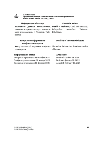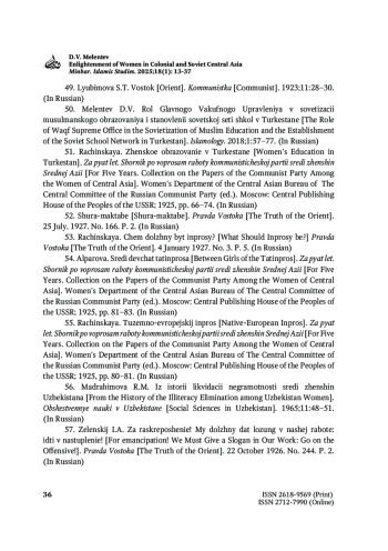 46. Мелентьев Д.В. Раскрепощение «европеек» Средней Азии в 1920-е гг. Восточный архив. 2024;1:75-83.