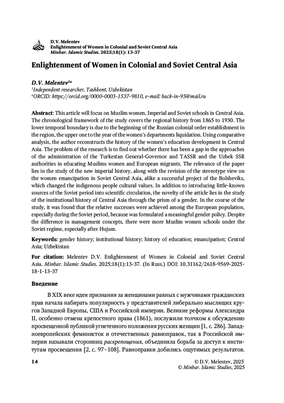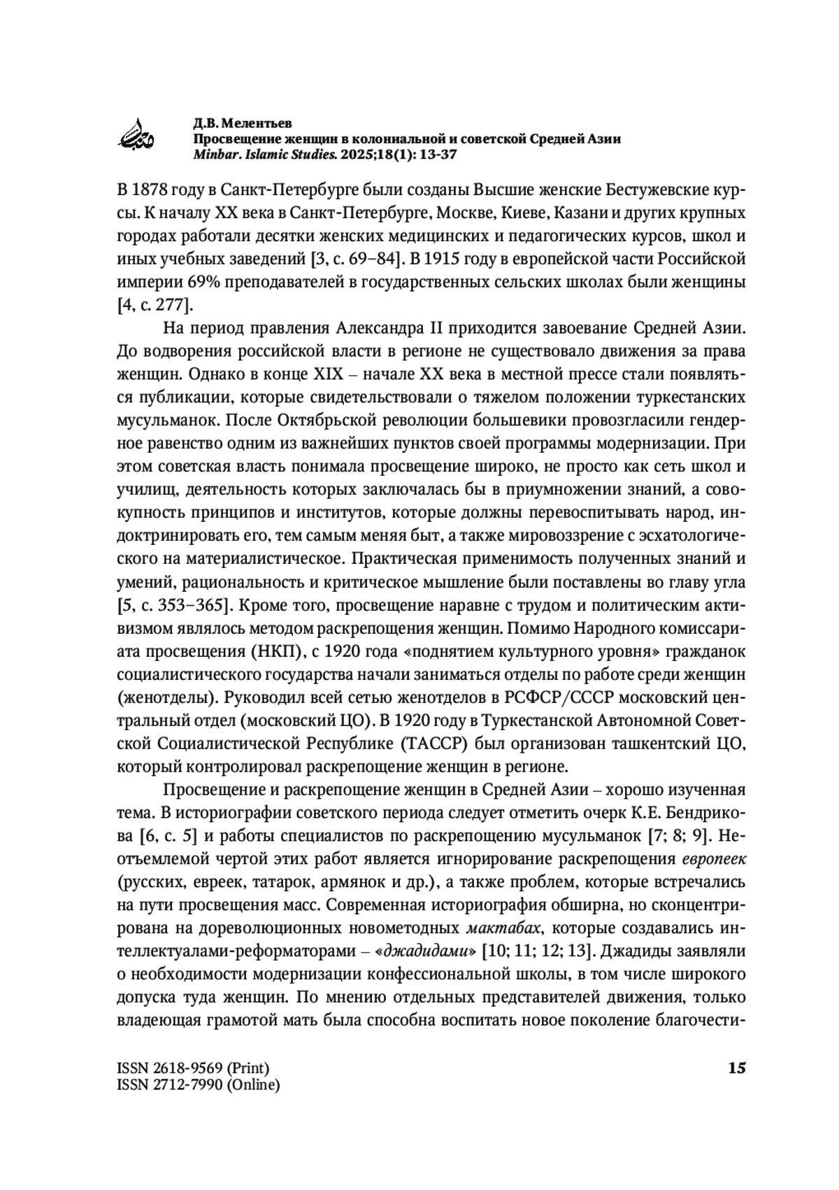 14. Бабаджанов Б.М. «Рай у ног матерей и женщин». Советские и постсоветские дискурсы о формах эмансипации мусульманских женщин. Общество, гендер и семья в Центральной Азии. 2019;1:23-59.