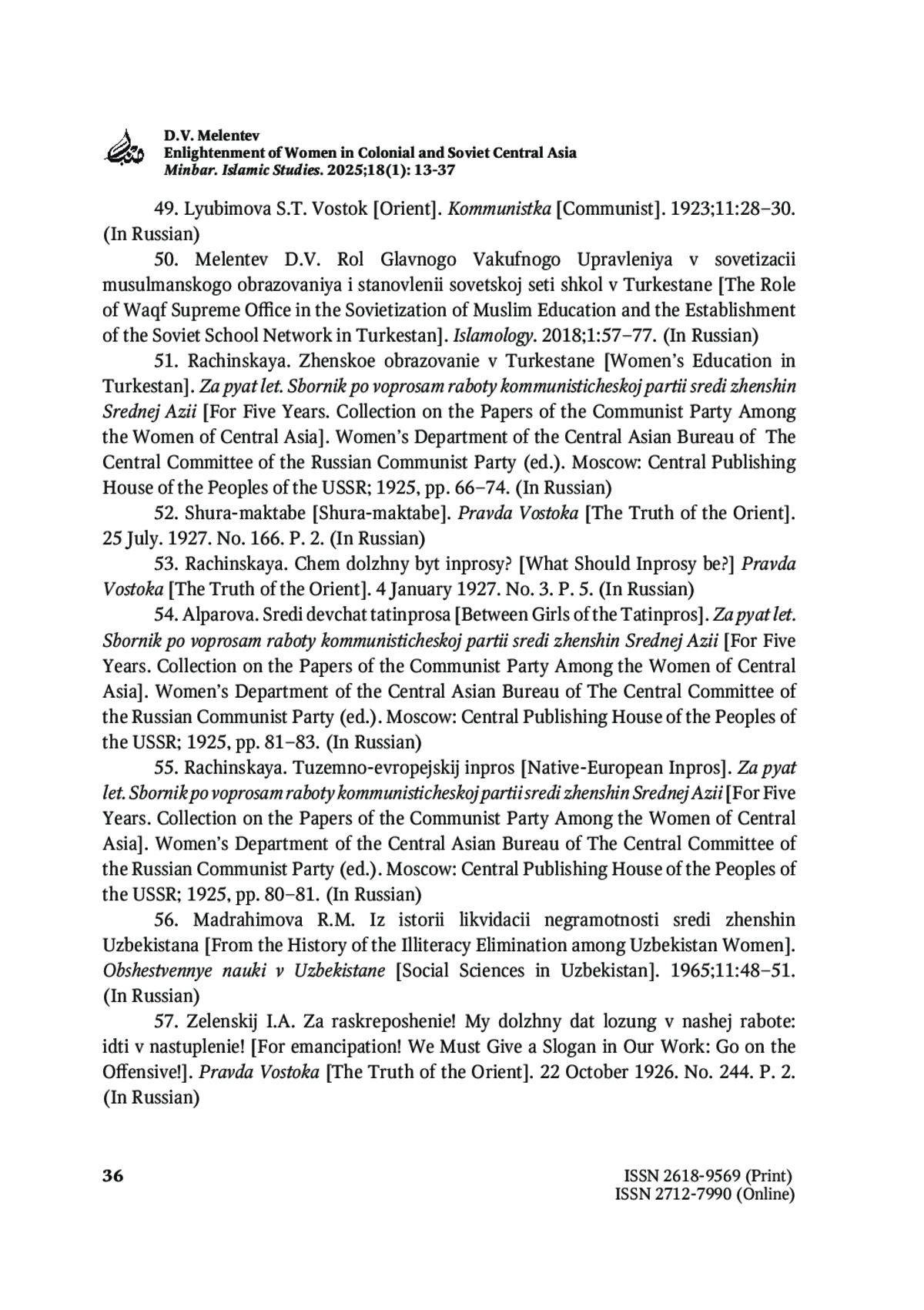 50. Мелентьев Д.В. Роль Главного Вакуфного Управления в советизации мусульманского образования и становлении советской сети школ в Туркестане. Islamology. 2018;1:57-77.