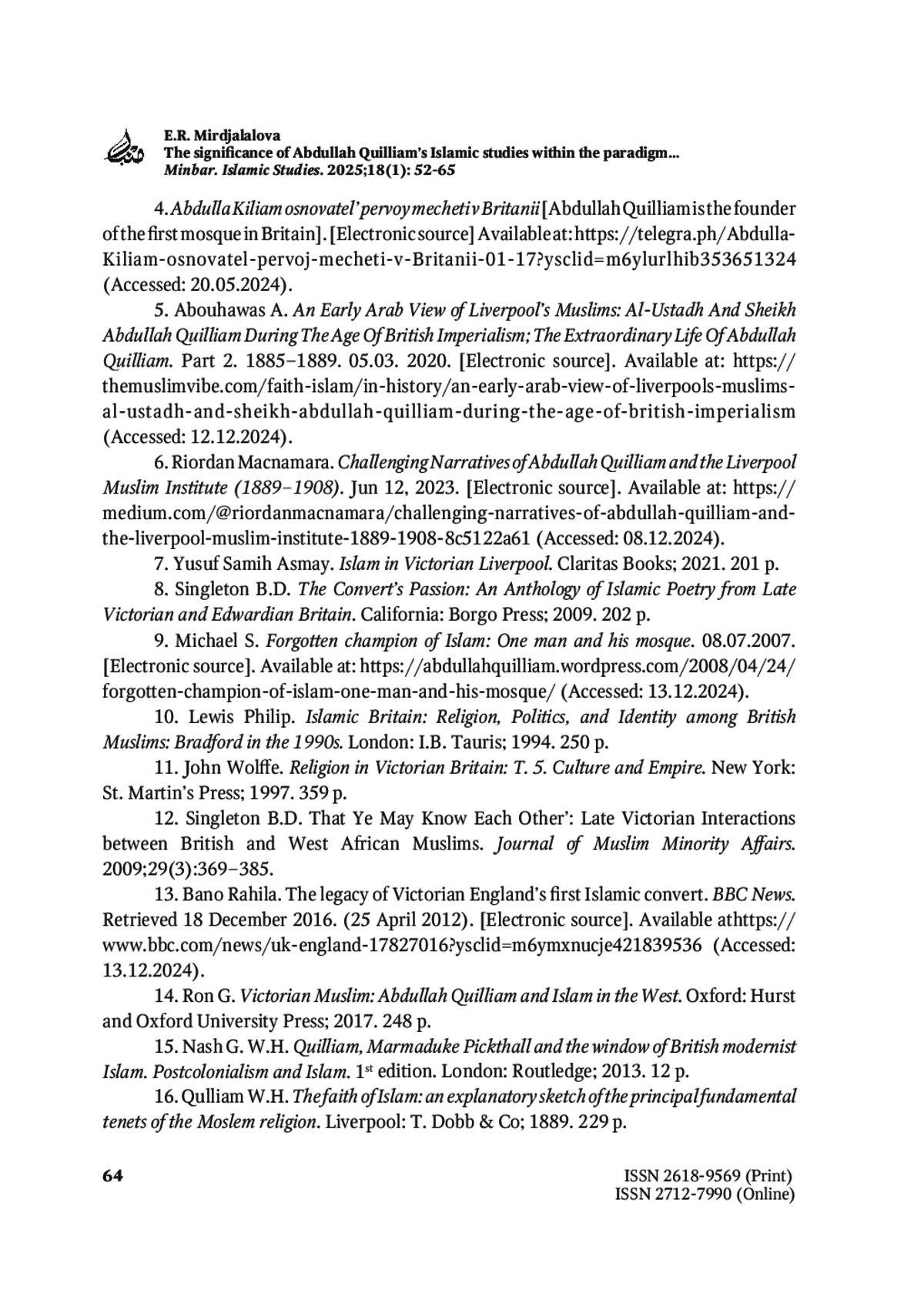 5. Abouhawas A. An Early Arab View of Liverpool’s Muslims: Al-Ustadh And Sheikh Abdullah Quilliam During The Age Of British Imperialism; The Extraordinary Life Of Abdullah Quilliam. Part 2. 1885-1889. 05.03.2020. [Электронный ресурс]. - Режим доступа: https://themuslimvibe.com/faith-islam/in-history/an-early-arab-view-of-liverpools-muslims-al-ustadh-and-sheikh-abdullah-quilliam-during-the-age-of-british-imperialism (дата обращения: 12.12.2024).
