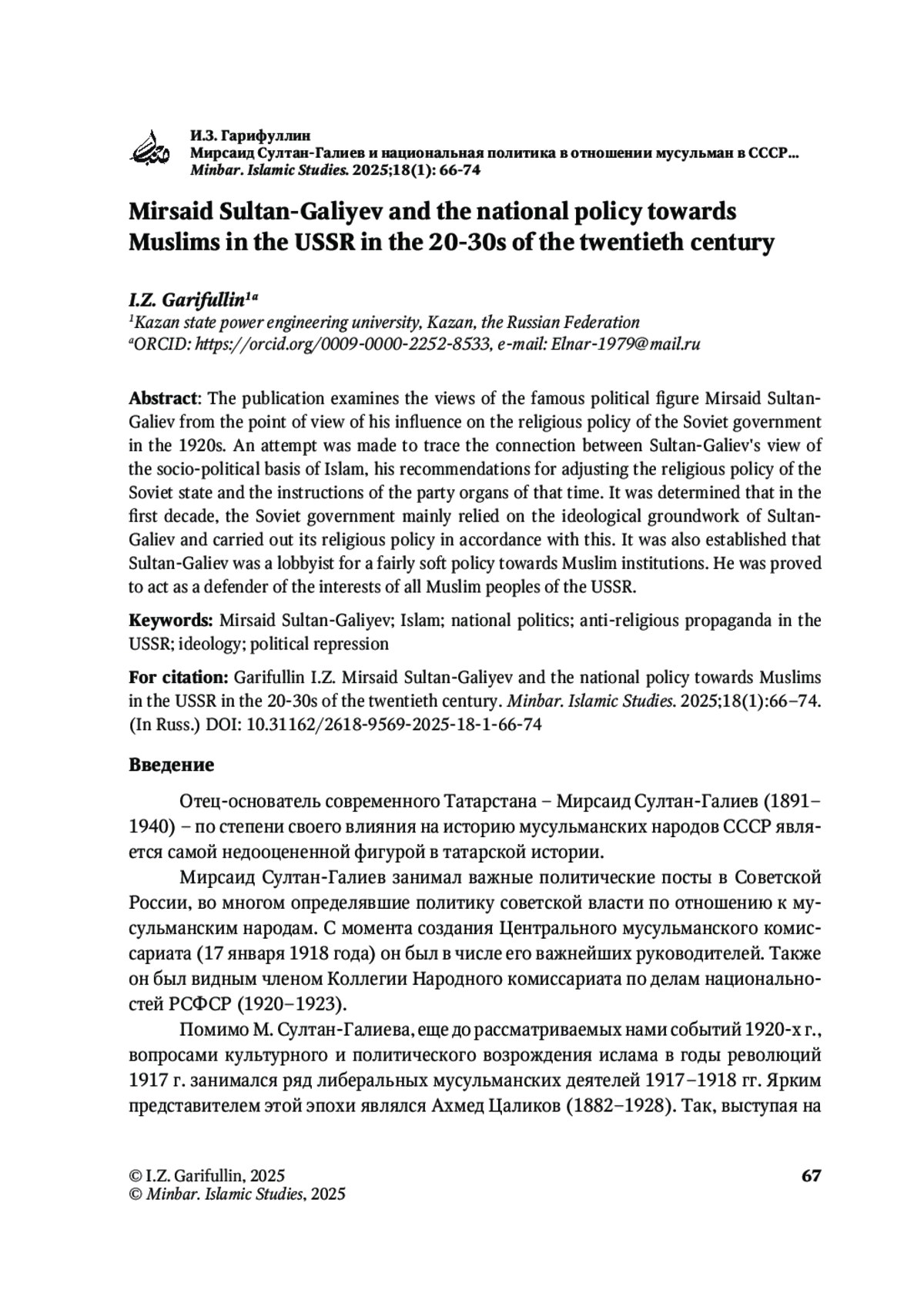 В публикации рассматриваются взгляды известного политического деятеля Мирсаида Султан-Галиева с точки зрения его влияния на религиозную политику советской власти в 1920-е годы. Проделана попытка проследить связь между взглядом Султан-Галиева на общественно-политическую основу ислама, его рекомендациями по корректировке религиозной политики Советского государства и предписаниями партийных органов того времени. Установлено, что в первое десятилетие советская власть в основном полагалась на идеологический задел Султан-Галиева и в соответствии с этим проводила свою религиозную политику. Определено, что Султан-Галиев был лоббистом достаточно мягкой политики по отношению к мусульманским институтам. Также выявлено, что он выступал защитником интересов всех мусульманских народов СССР.