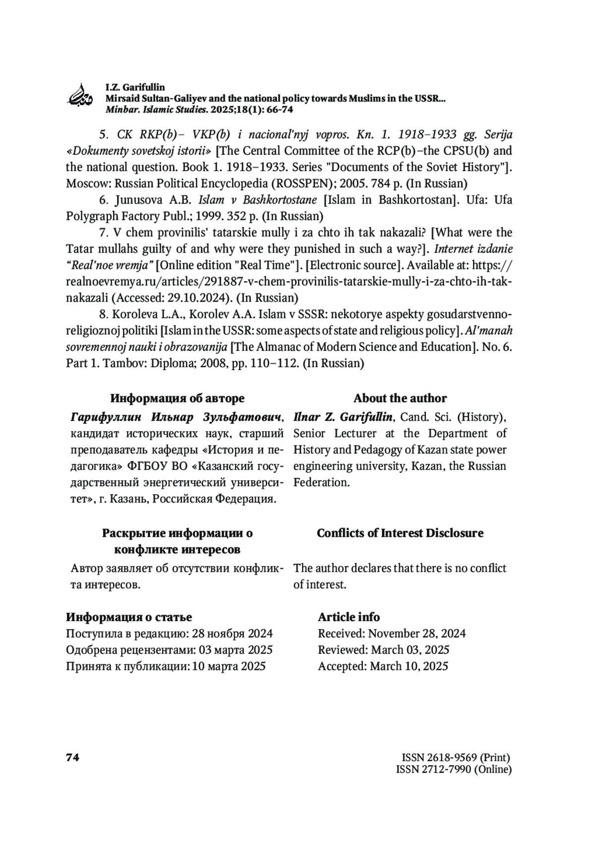 3. Исламгулова И. Р. Политические взгляды Мирсаида Султан-Галиева: автореф. дис. … канд. ист. наук. Уфа: Издательство Башкирского государственного университета; 2005. 22 с.