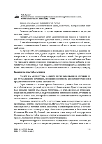 Целью данной работы является прояснение внутренних причин непонимания в контексте иудео-мусульманского взаимодействия на богословском, теоретическом и историко-практическом уровнях, а также поиск способов их преодоления.