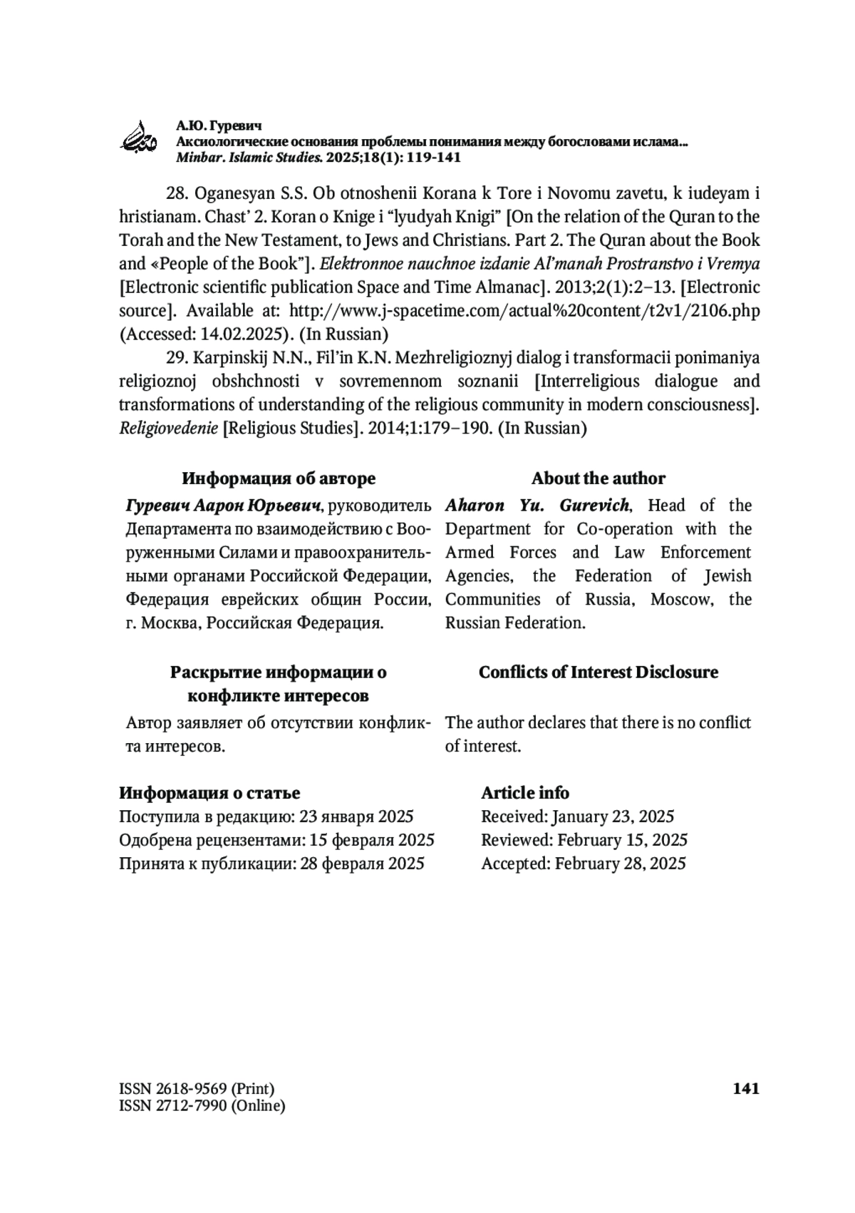 29. Карпинский Н.Н., Фильин К.Н. Межрелигиозный диалог и трансформации понимания религиозной общности в современном сознании. Религиоведение. 2014;1:179-190.