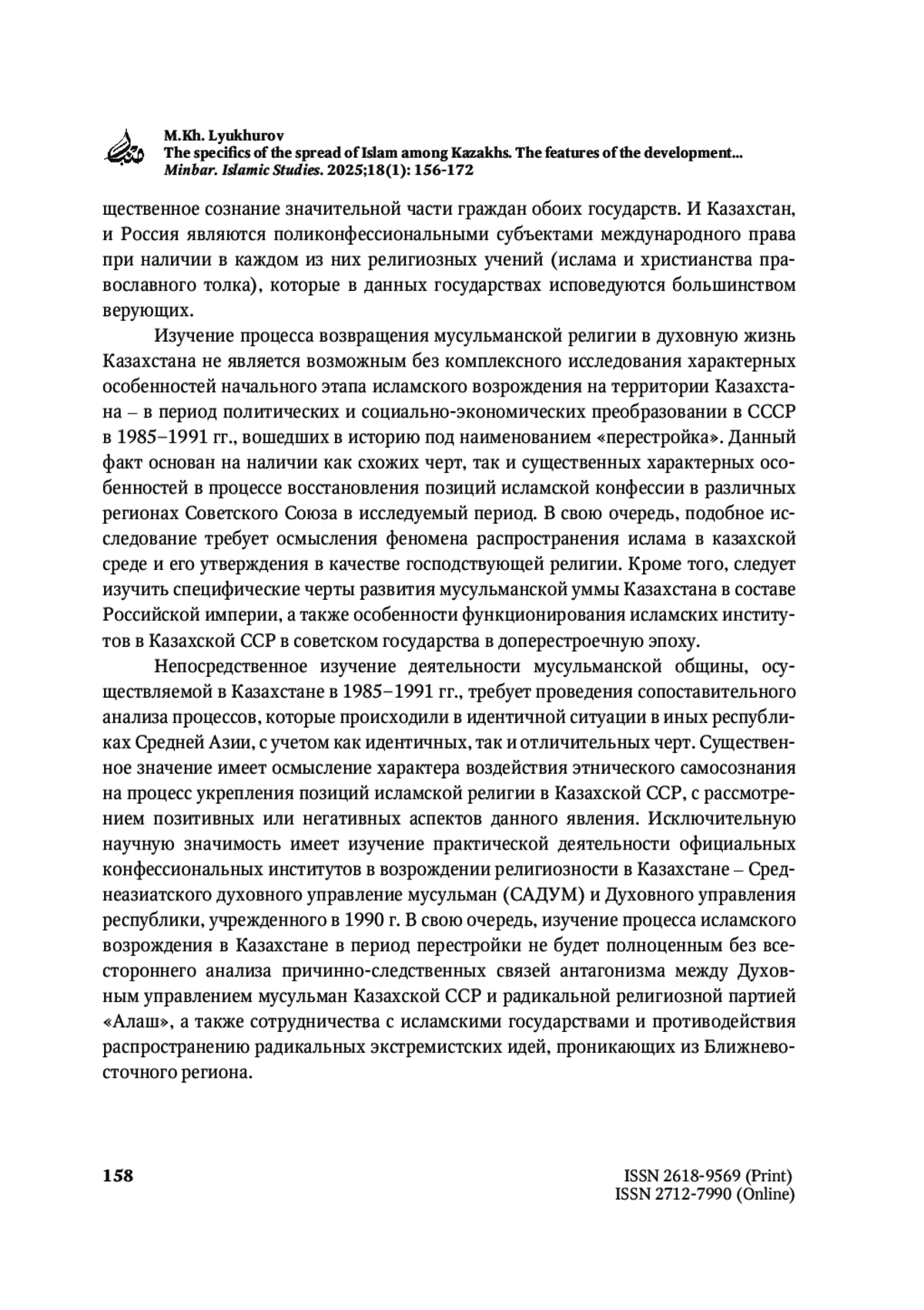 Данная статья посвящена описанию характерных особенностей развития исламской уммы в Казахской ССР в период перестройки 1985–1991 гг. Автор проводит краткий анализ специфики распространения мусульманской религии среди казахов. В статье рассмотрены особенности исламского возрождения в Казахской ССР с сравнении с особенностями данного процесса в других республиках советской Средней Азии. Автор анализирует роль казахского национального самосознания в процессе исламского возрождения в Казахстане в 1985–1991 гг. В статье описаны особенности формирования и развития Духовного управления мусульман Казахской ССР, установления партнерских связей с мусульманским миром, а также противодействия радикальному конфессиональному движению «Алаш» и проникновению в республику экстремистских идей с Ближнего Востока.