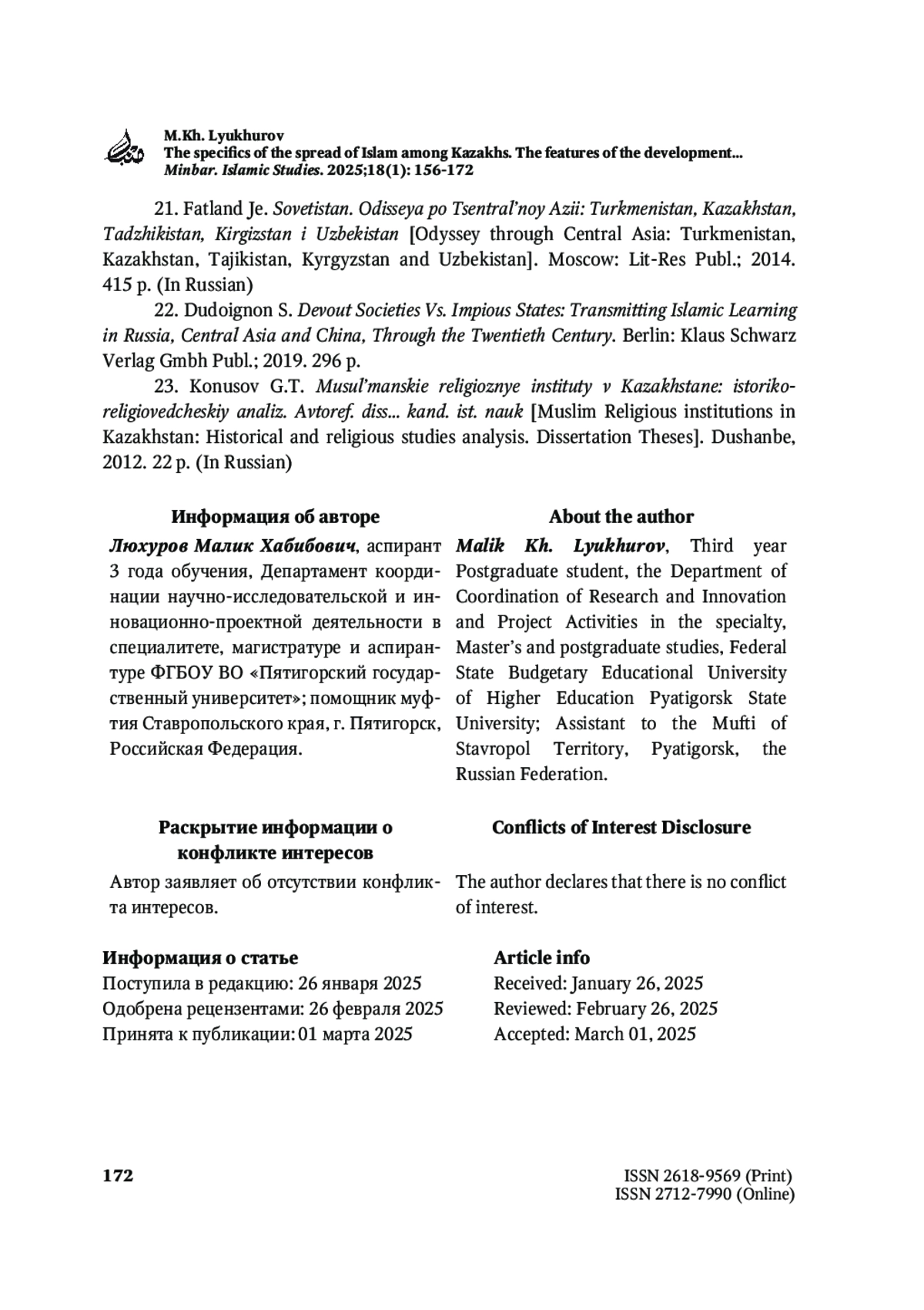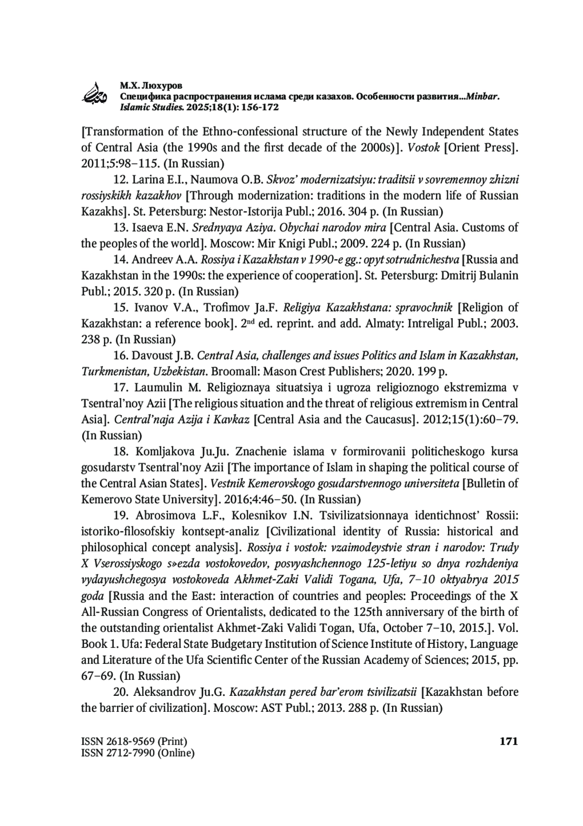 9. Шамшадин К., Альмухаметов А. Ислам в современном Казахстане. Россия и исламский мир. 2013;1:64-71.