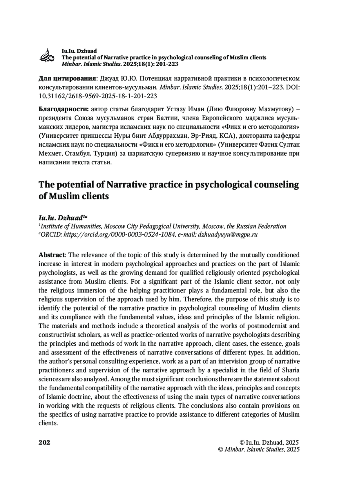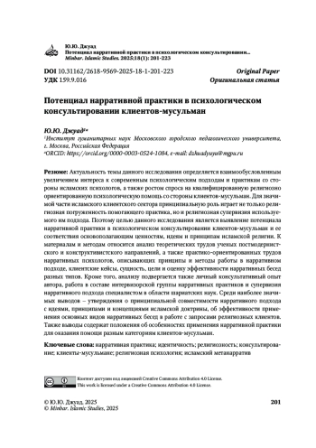 Актуальность темы данного исследования определяется взаимообусловленным увеличением интереса к современным психологическим подходам и практикам со стороны исламских психологов, а также ростом спроса на квалифицированную религиозно ориентированную психологическую помощь со стороны клиентов-мусульман. Для значимой части исламского клиентского сектора принципиальную роль играет не только религиозная погруженность помогающего практика, но и религиозная супервизия используемого им подхода. Поэтому целью данного исследования является выявление потенциала нарративной практики в психологическом консультировании клиентов-мусульман и ее соответствия основополагающим ценностям, идеям и принципам исламской религии. К материалам и методам относится анализ теоретических трудов ученых постмодернистского и конструктивистского направлений, а также практико-ориентированных трудов нарративных психологов, описывающих принципы и методы работы в нарративном подходе, клиентские кейсы, сущность, цели и оценку эффективности нарративных бесед разных типов. Кроме того, анализу подвергается также личный консультативный опыт автора, работа в составе интервизорской группы нарративных практиков и супервизия нарративного подхода специалистом в области шариатских наук. Среди наиболее значимых выводов – утверждения о принципиальной совместимости нарративного подхода с идеями, принципами и концепциями исламской доктрины, об эффективности применения основных видов нарративных бесед в работе с запросами религиозных клиентов. Также выводы содержат положения об особенностях применения нарративной практики для оказания помощи разным категориям клиентов-мусульман.